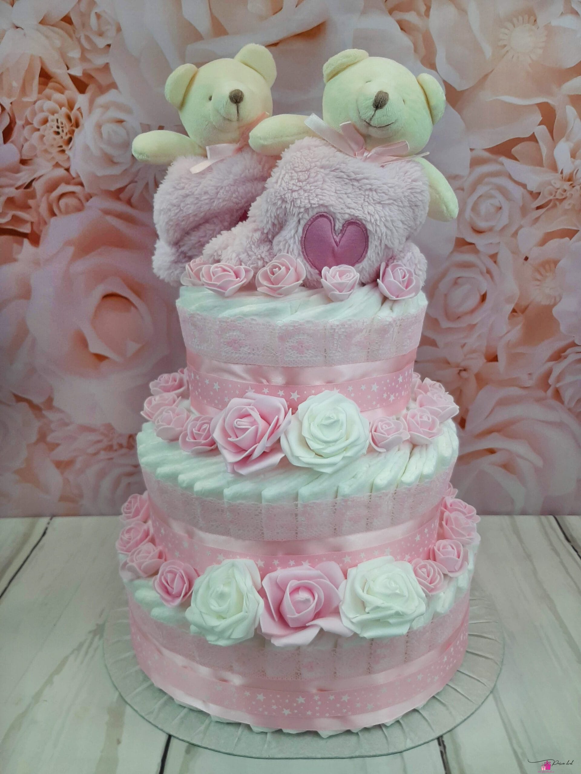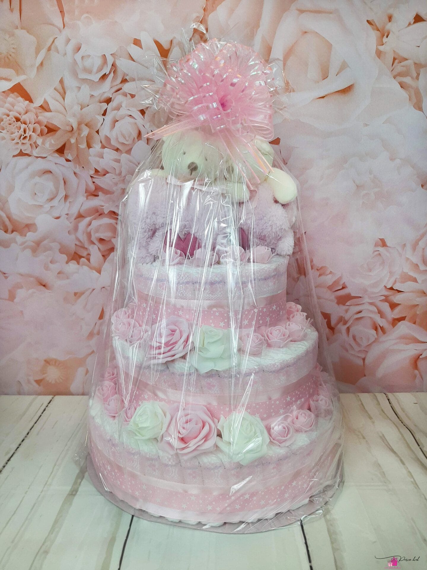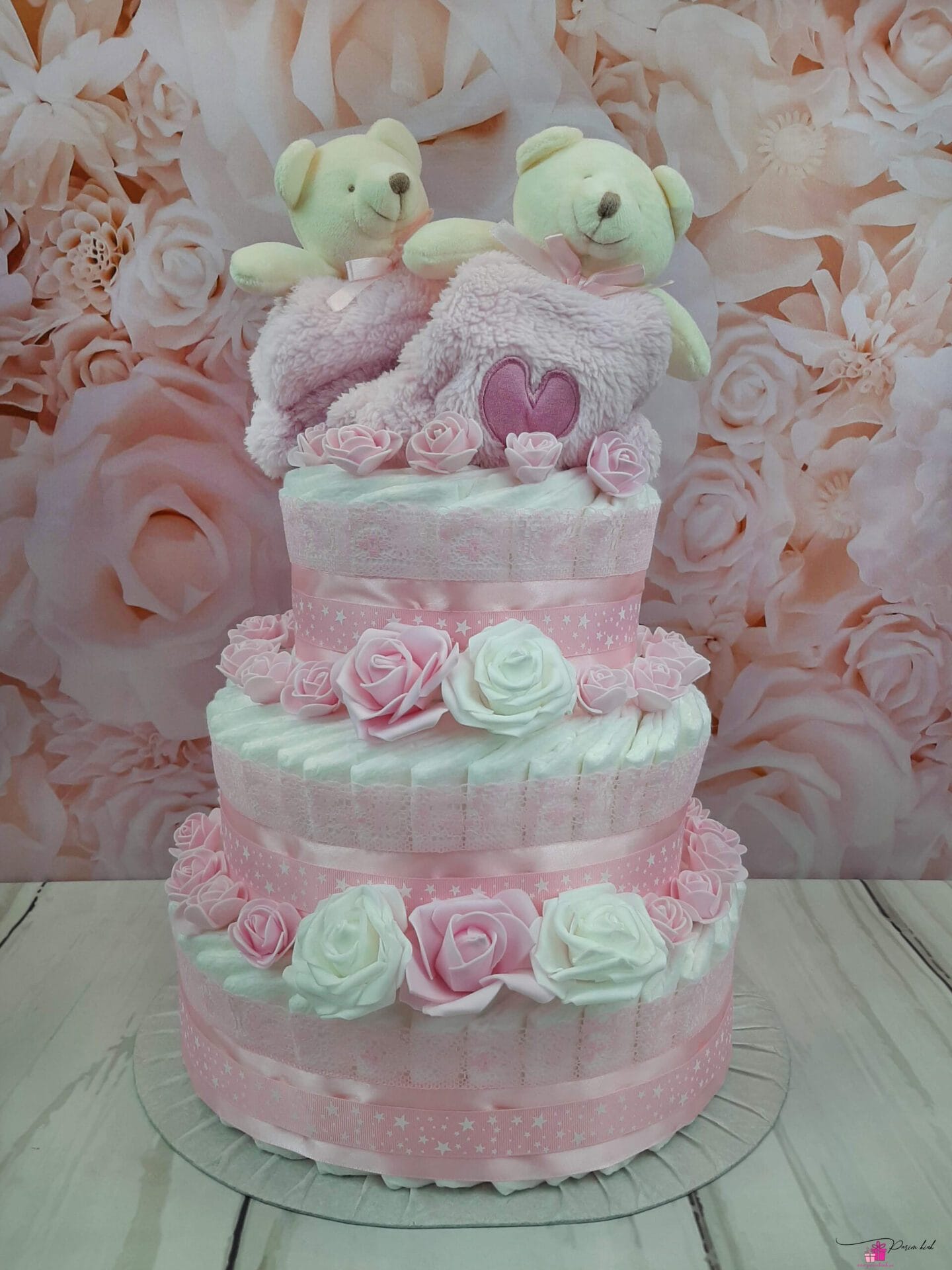 Mähkmetort on valmistatud 90-st mähkmest, pakitud tsellofaani ning kaunistatud suure rosetiga.