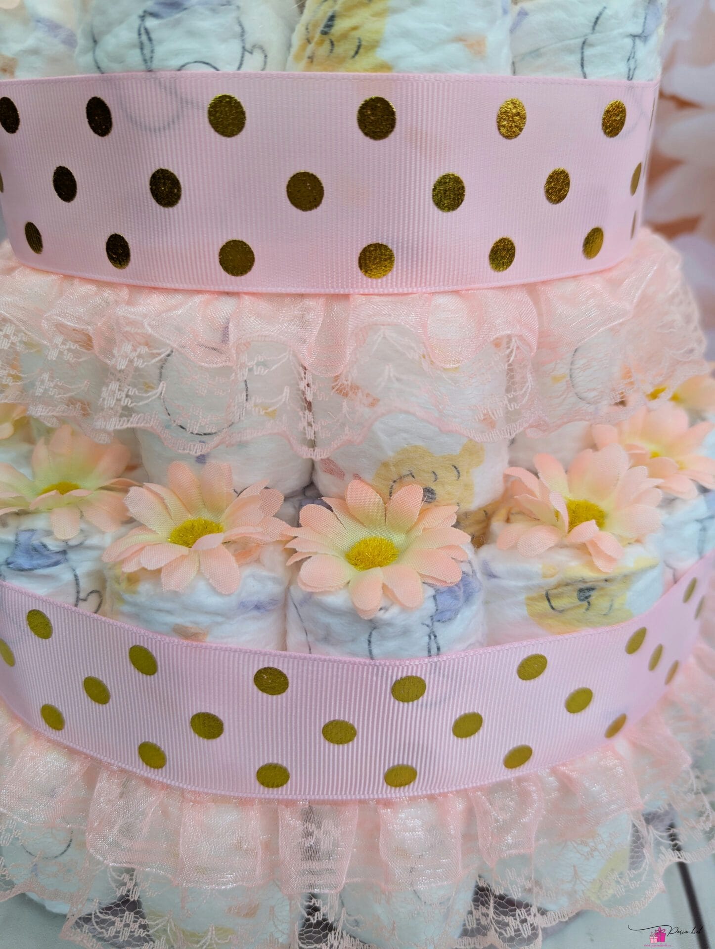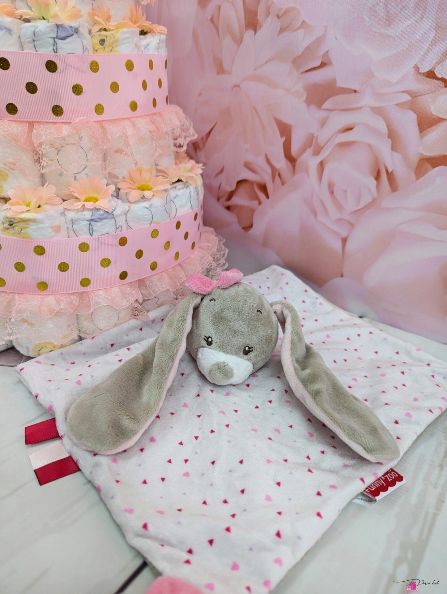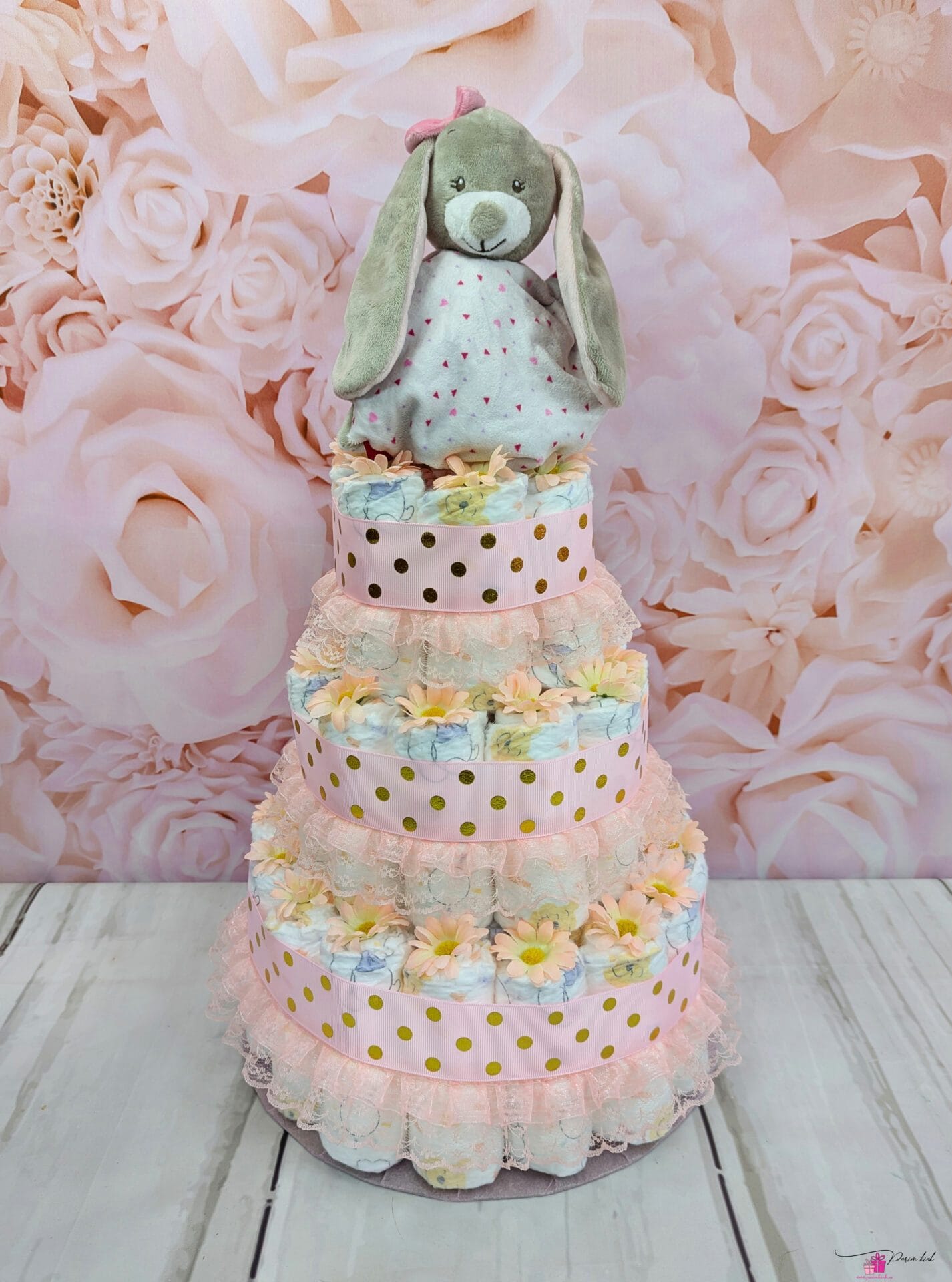 Mähkmetort on valmistatud 55-st mähkmest, pakitud tsellofaani ning kaunistatud suure rosetiga.