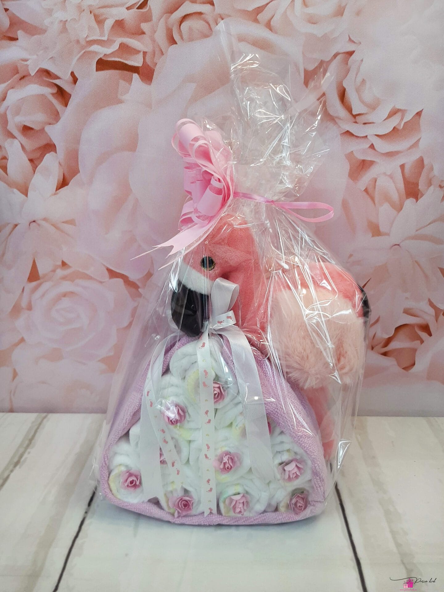 Kõik teavad, et kured toovad lapsi. Kuna tööd on palju, siis flamingod juba harjutavad, esialgu mähkmete toomist. Tort sisaldab lisaks mähkmetele ka flamingot ning frotee rätikut 30x50cm.
