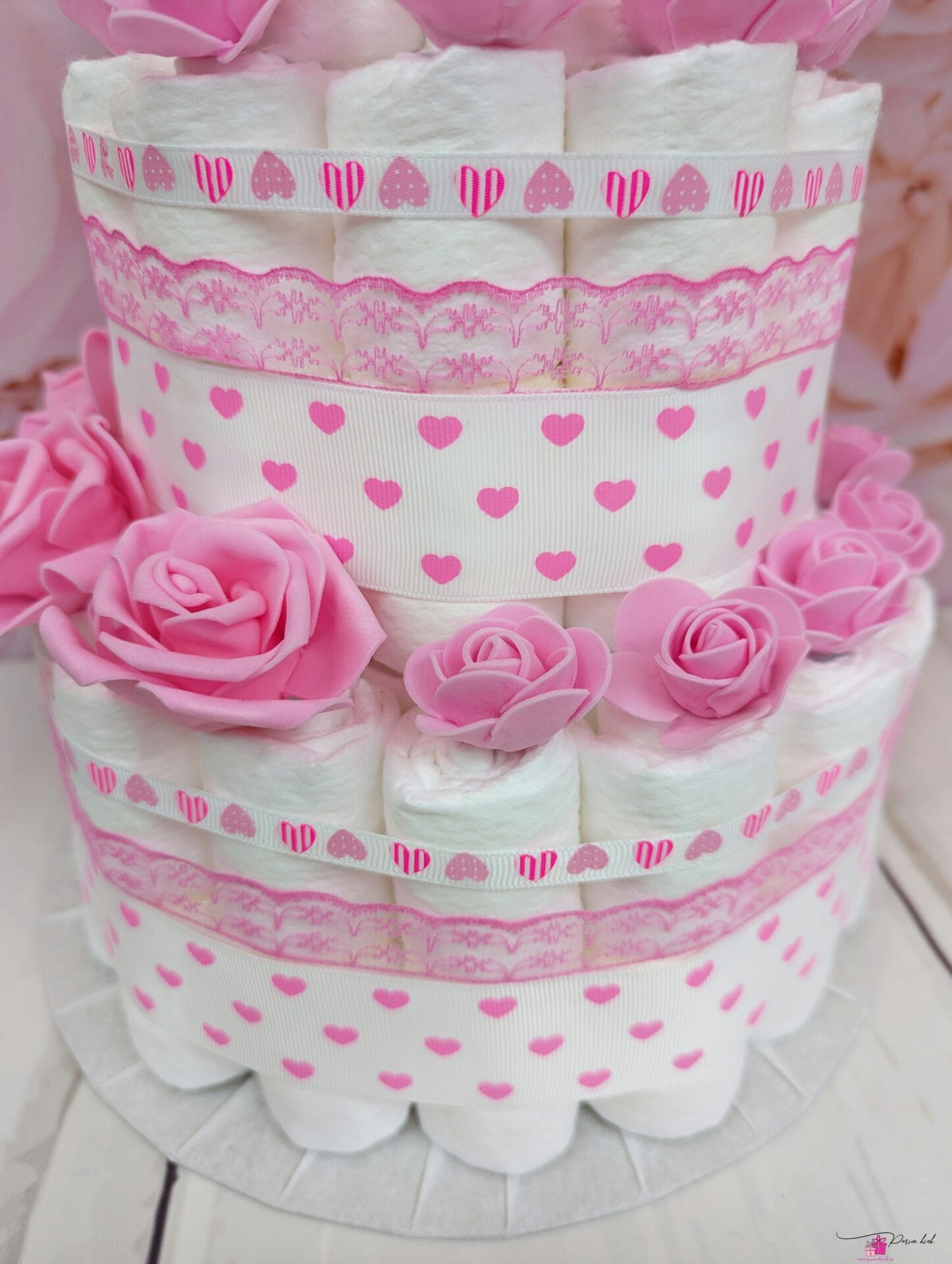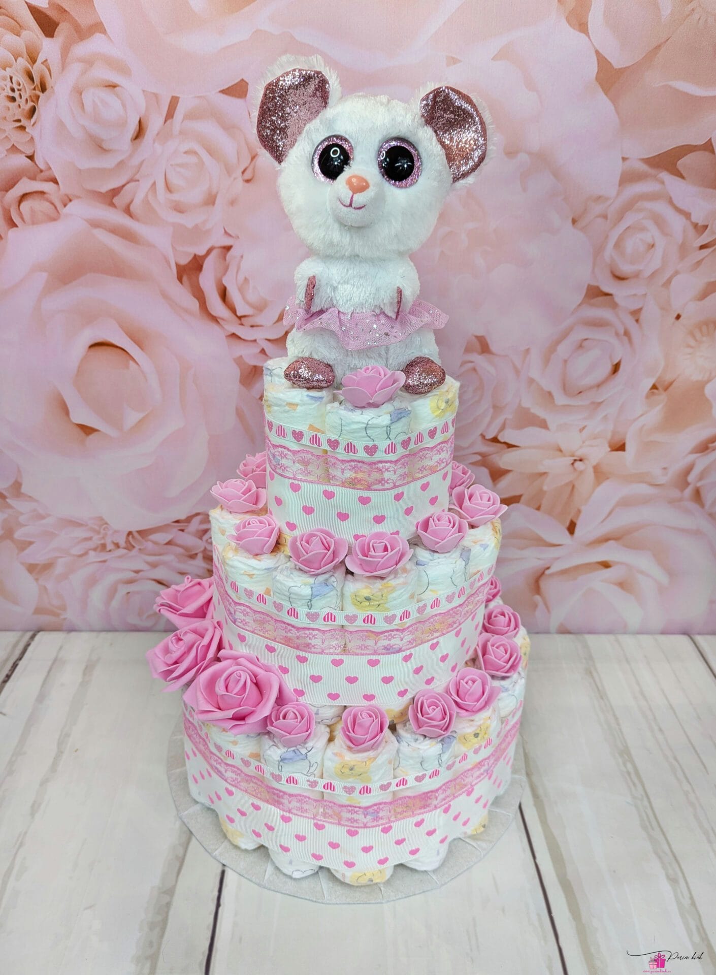 Mähkmetort on valmistatud 55-st mähkmest, pakitud tsellofaani ning kaunistatud suure rosetiga.