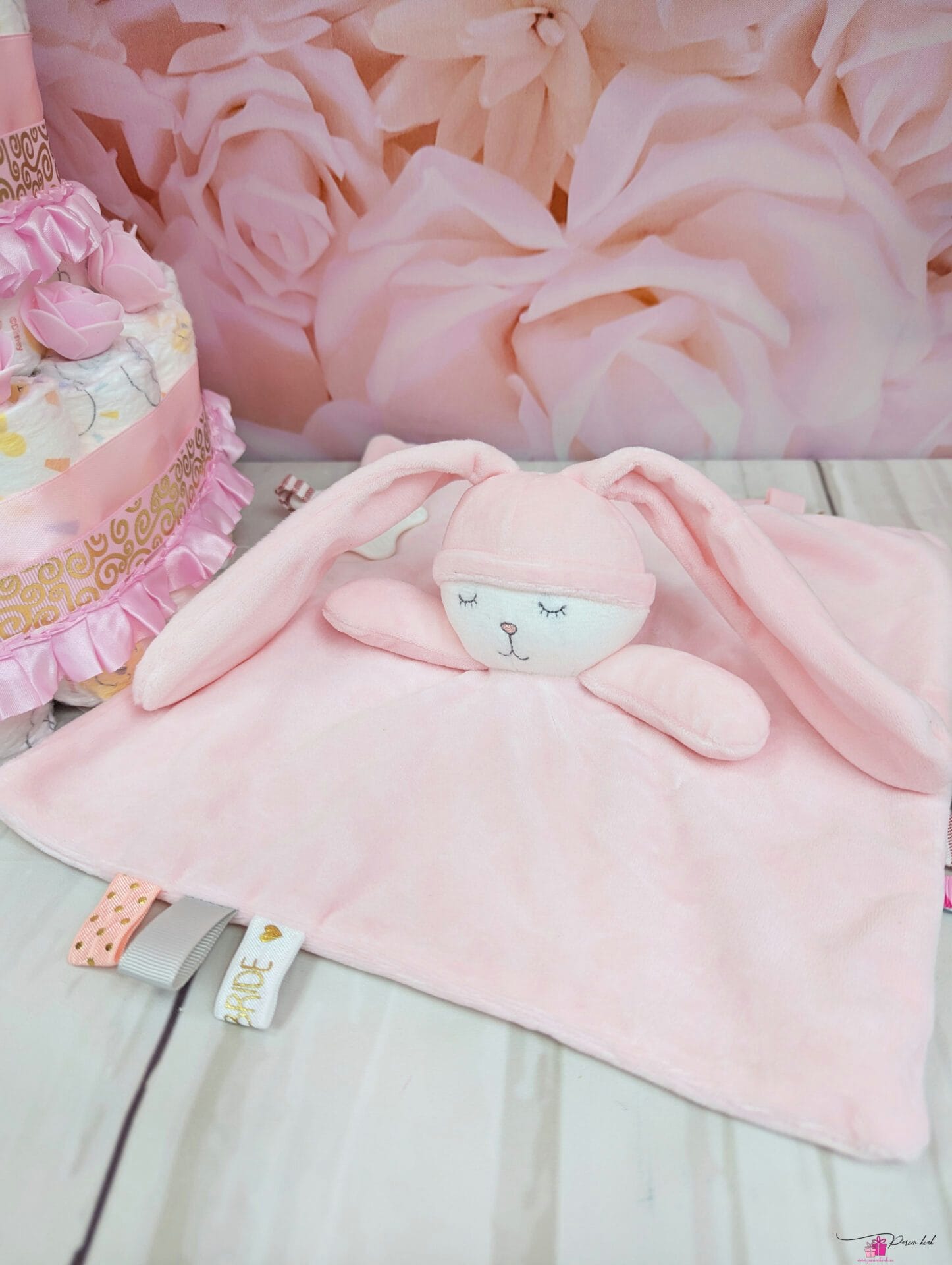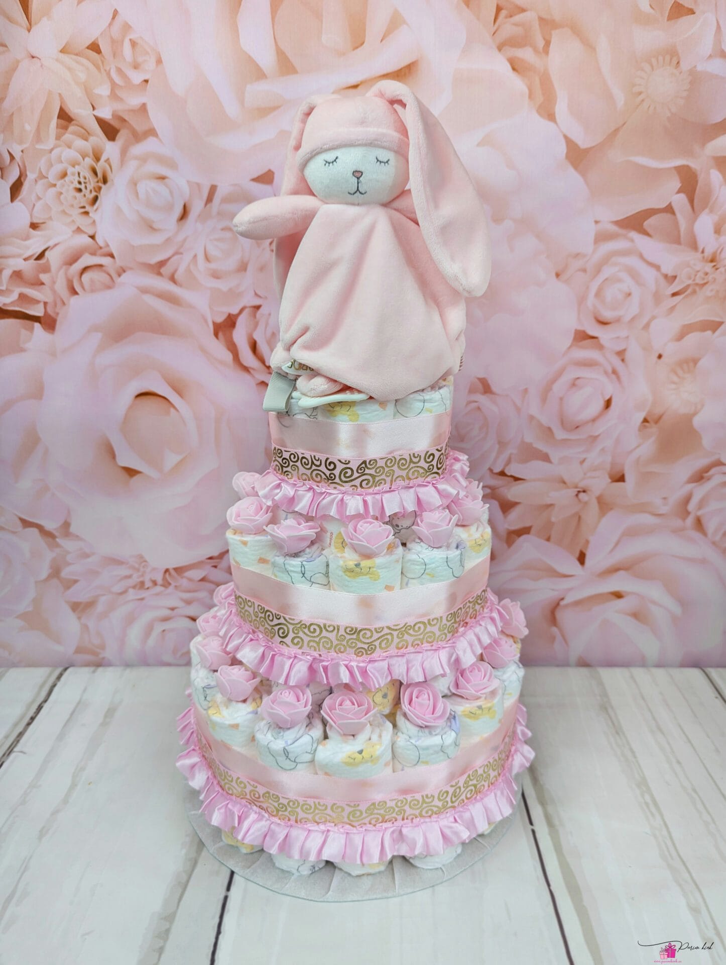 Mähkmetort on valmistatud 55-st mähkmest, pakitud tsellofaani ning kaunistatud suure rosetiga.