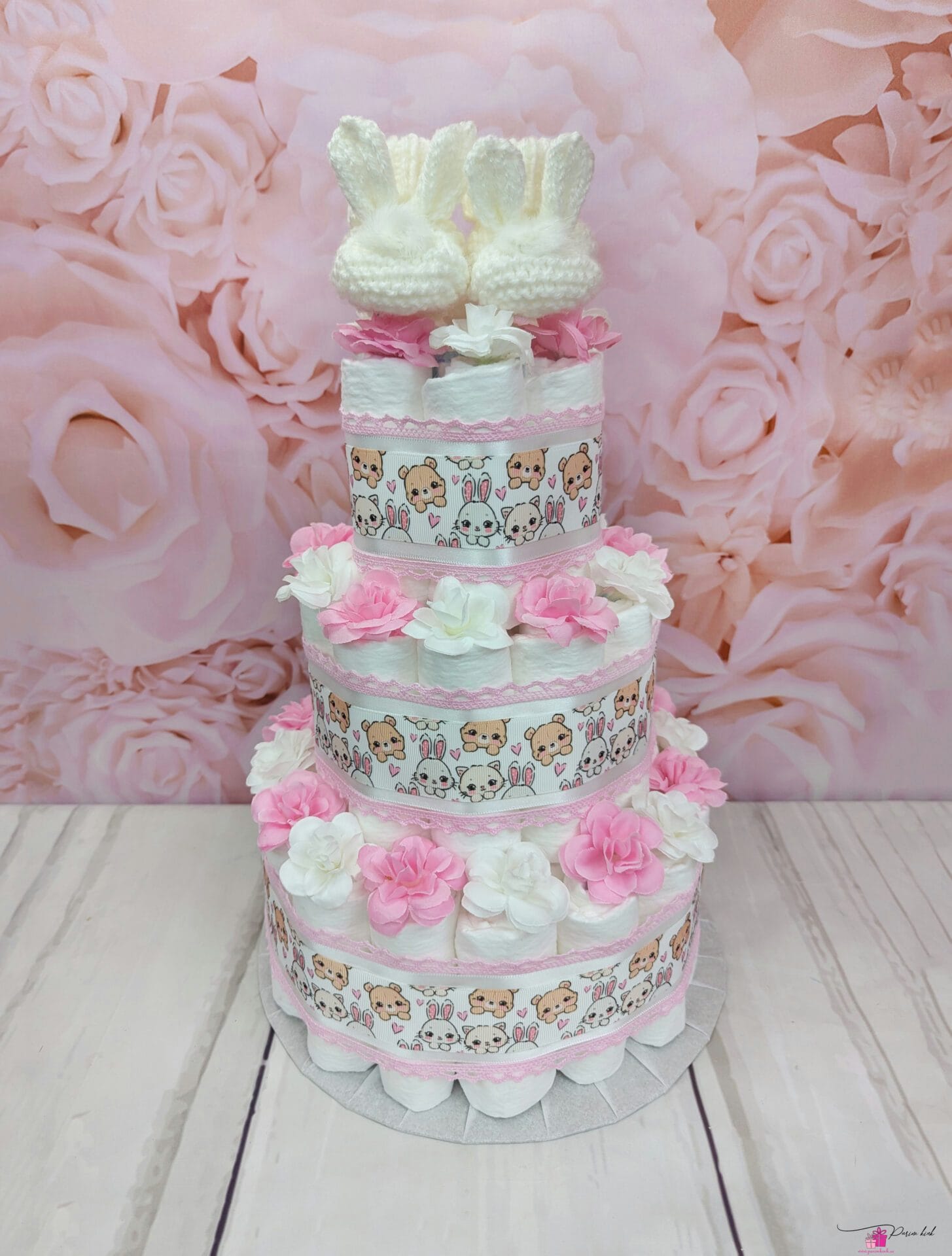 Mähkmetort, mille otsas on meie enda käsitööna kootud jänkupapud. Papude kinkimine katsikuks on juba väga vana komme – mähkmetortide kinkimine aga üsna uudne – miks mitte ühendada need kaks, et säiliks traditsioon moodsalt!