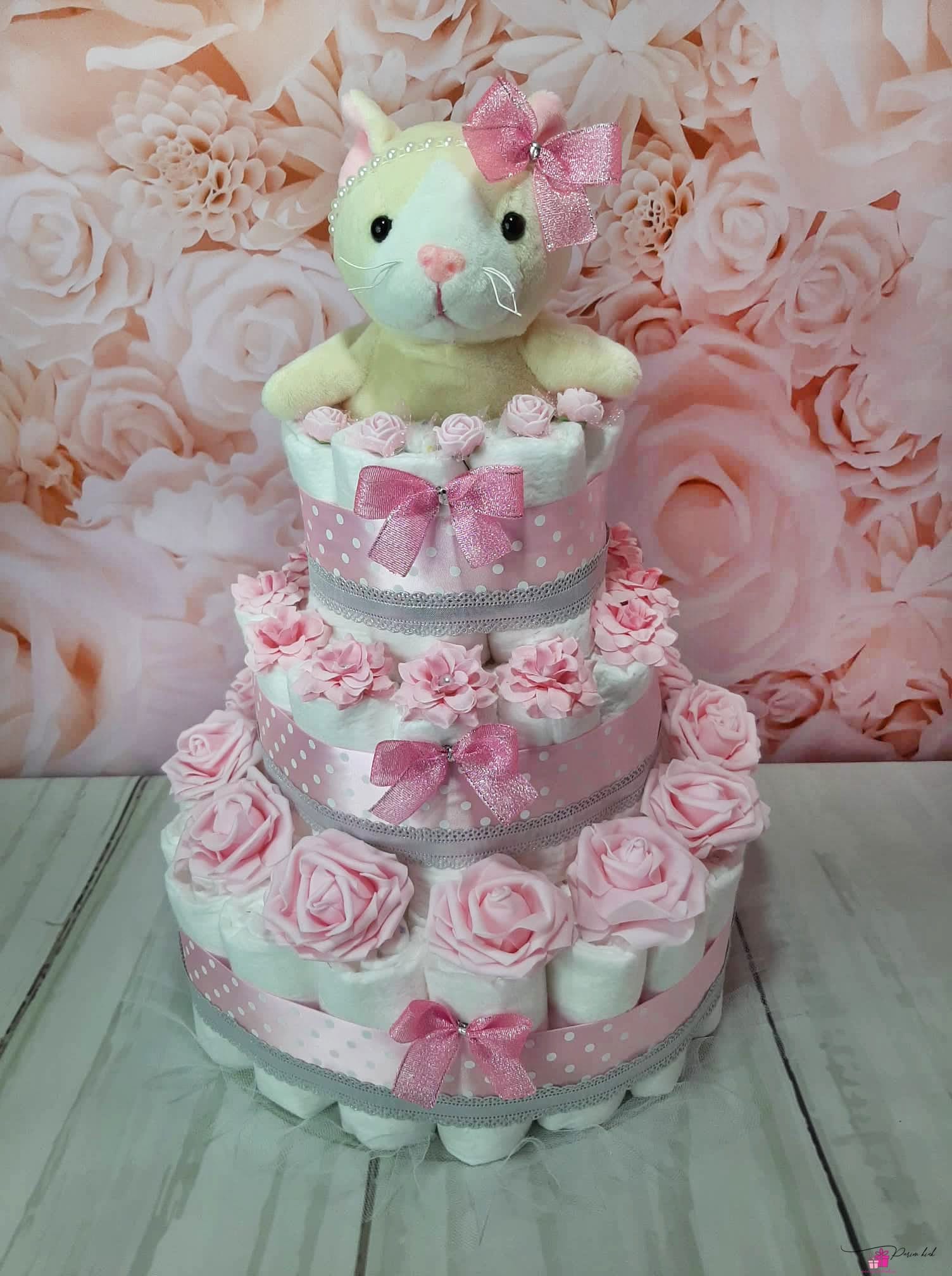 Roosa kassiga mähkmetort, mis on iga väikese beebitüdruku unistus!