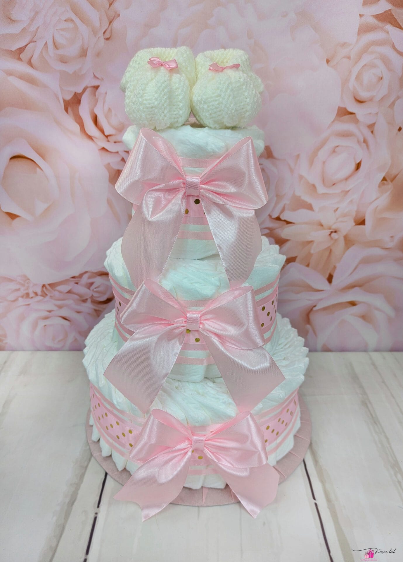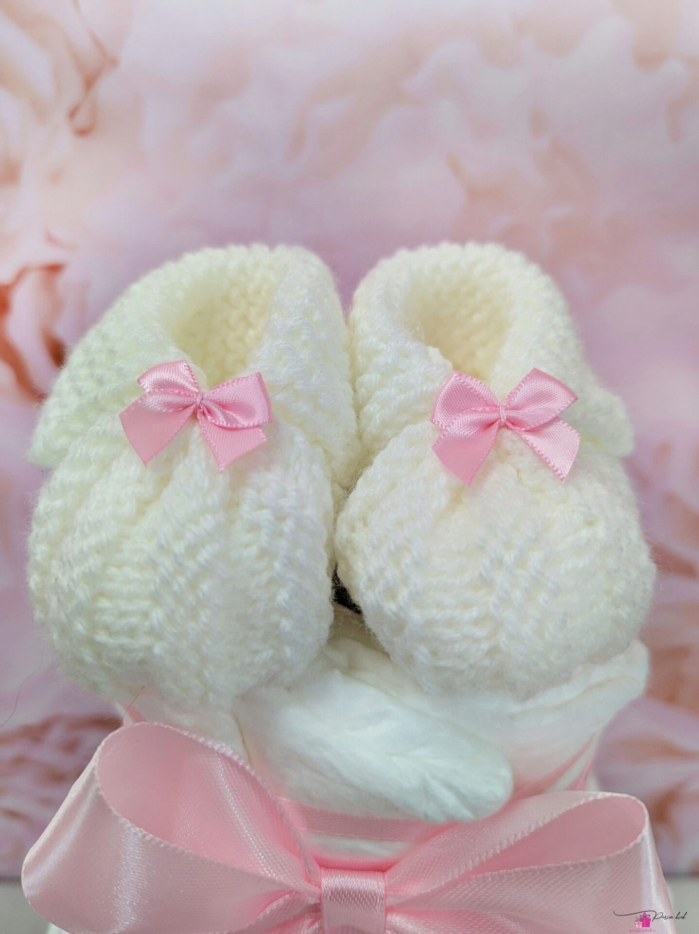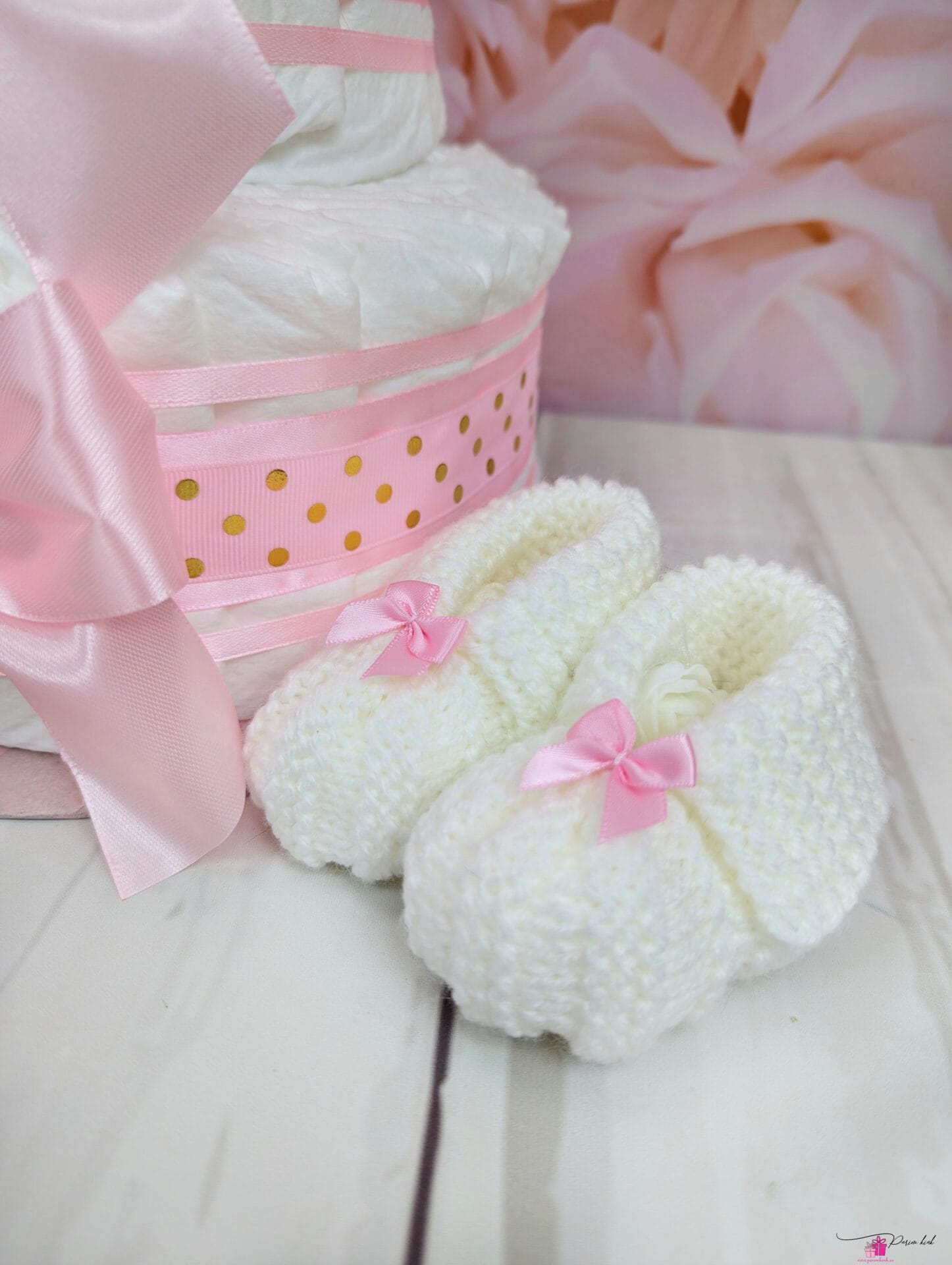 Mähkmetort, mille otsas on meie enda käsitööna kootud beebipapud. Papude kinkimine katsikuks on juba väga vana komme – mähkmetortide kinkimine aga üsna uudne – miks mitte ühendada need kaks, et säiliks traditsioon moodsalt!