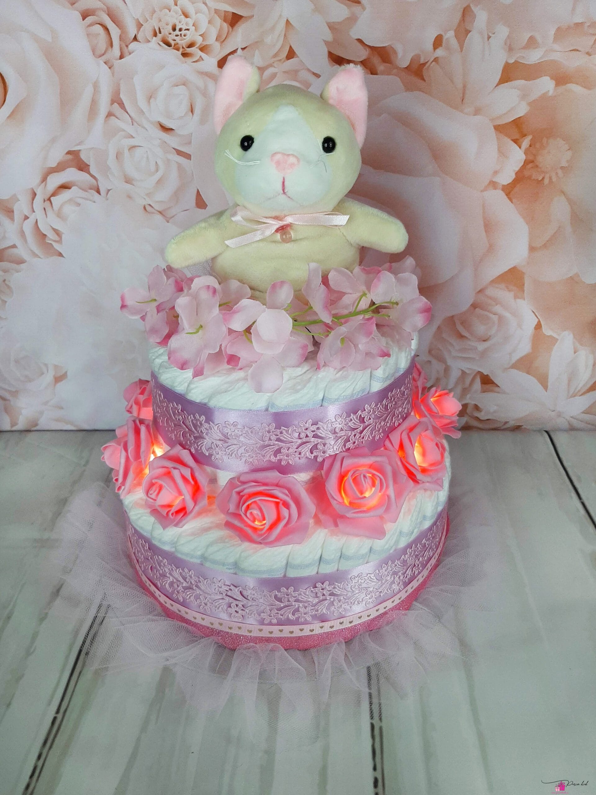 Selle tordiga tuleb kaasa palju üllatusi! Sest tegu ei ole tavaliste roosidega, vaid LED tuledest roosidega, mis töötavad patareidel, mis kuuluvad komplekti, et torti üle andes, oleks vanemate üllatus maksimaalne. Lisaks ei ole tegu üldse mitte tavalise kassiga, sest pöörates kassi pahupidi muutub ta hoopis hiireks!