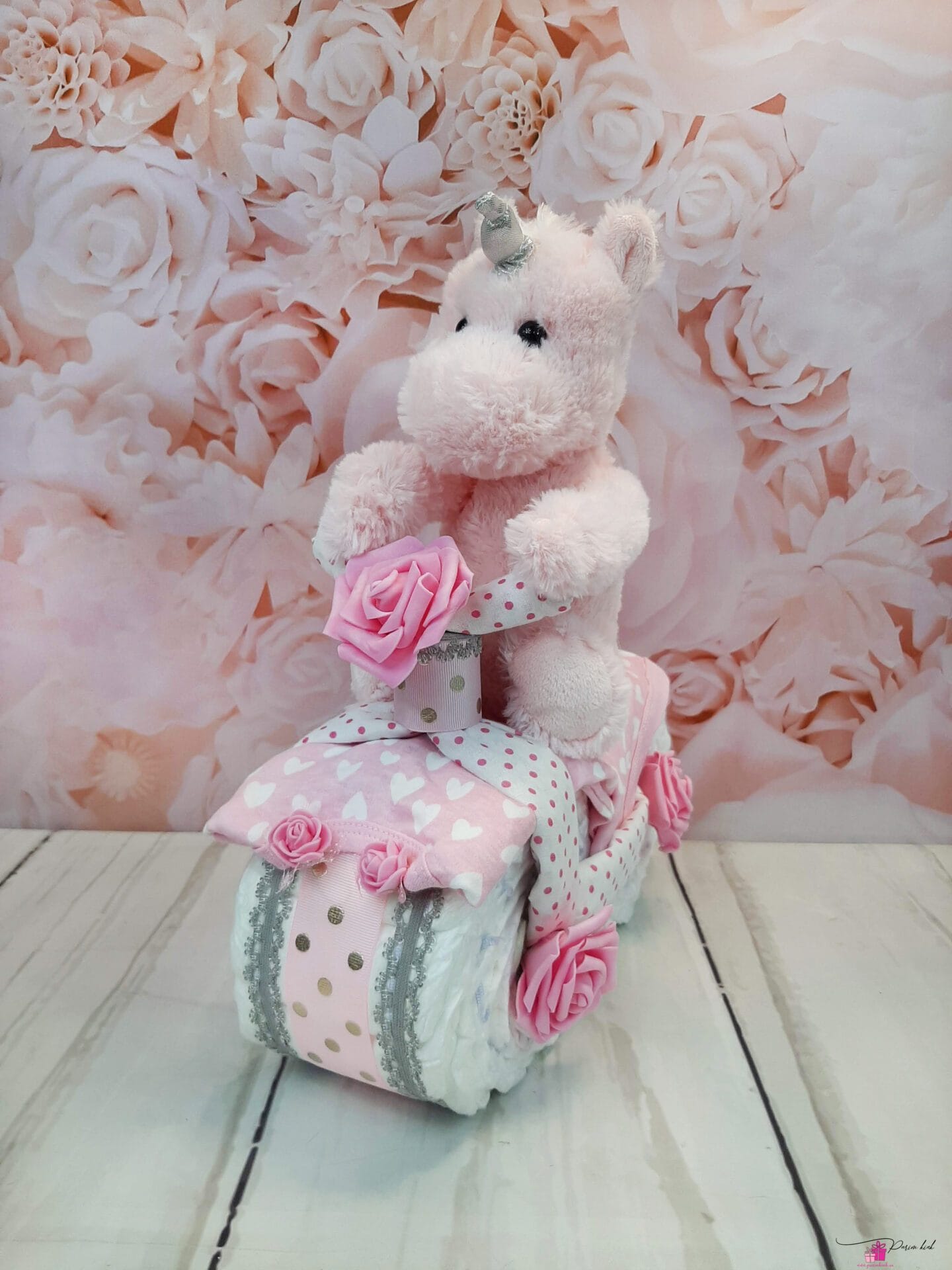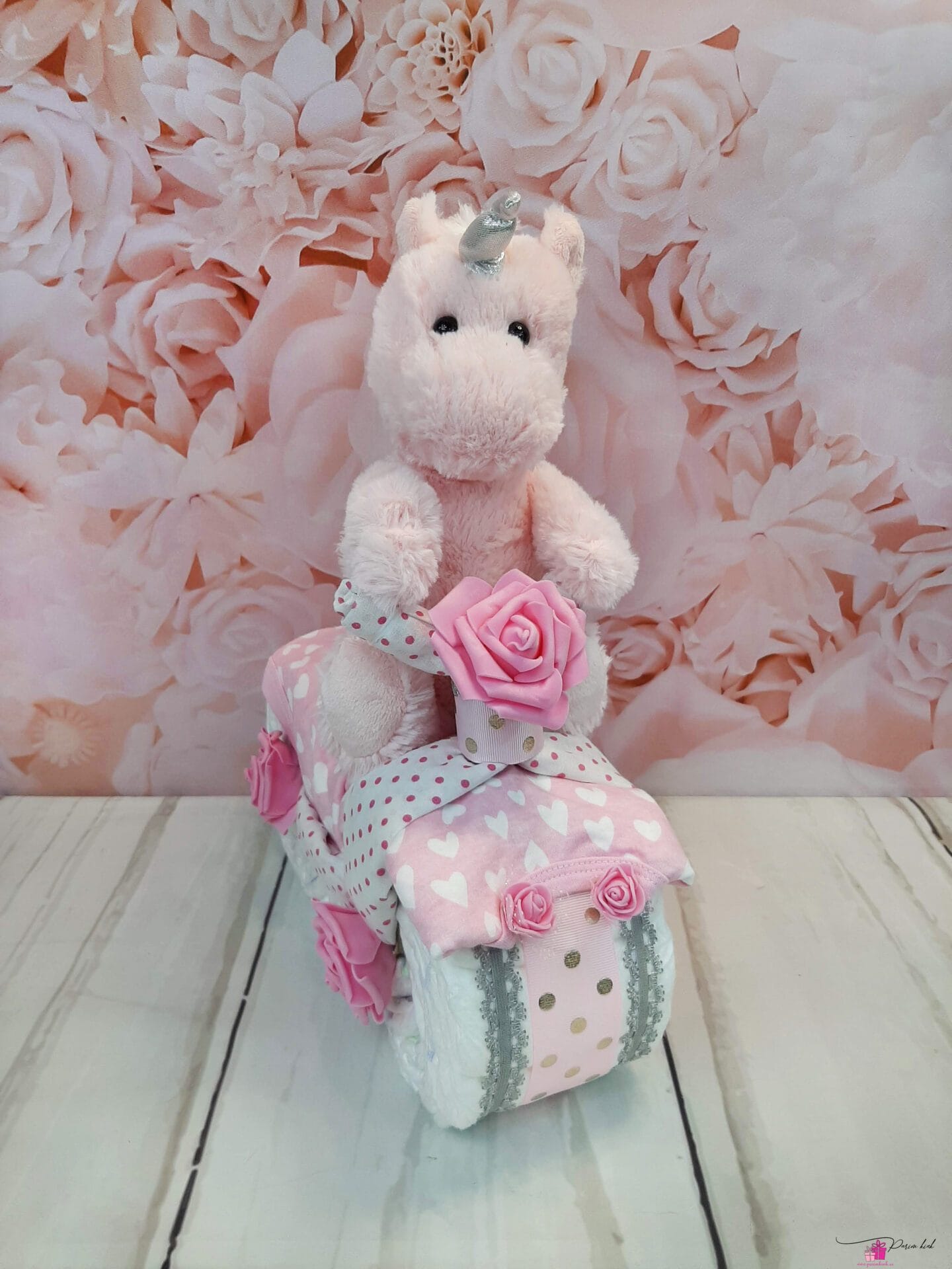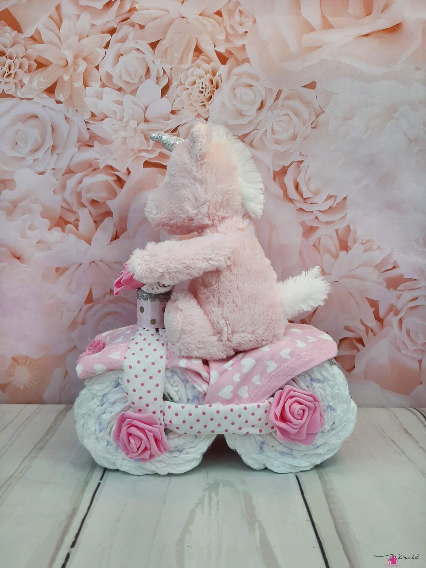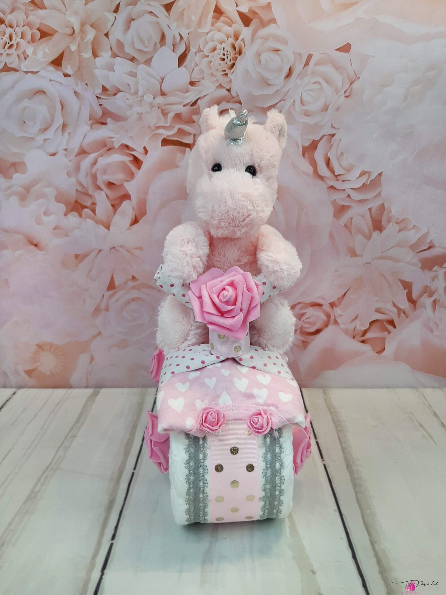 Mähkmetort on valmistatud 20-st mähkmest, pakitud tsellofaani ning kaunistatud suure rosetiga.