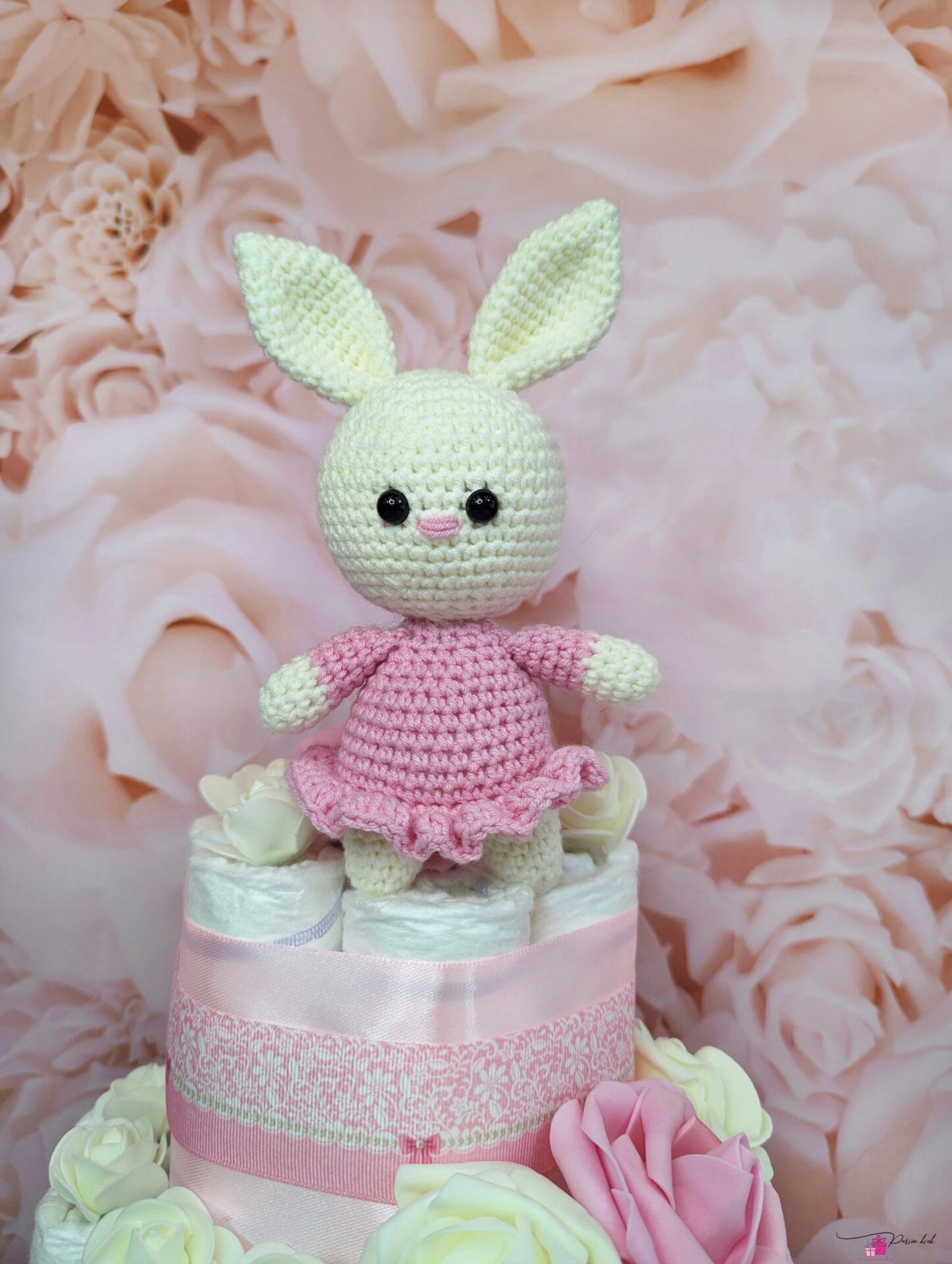 Tordi otsas on meie enda heegeldatud beebisõbralikust lõngast amigurumi jänes.