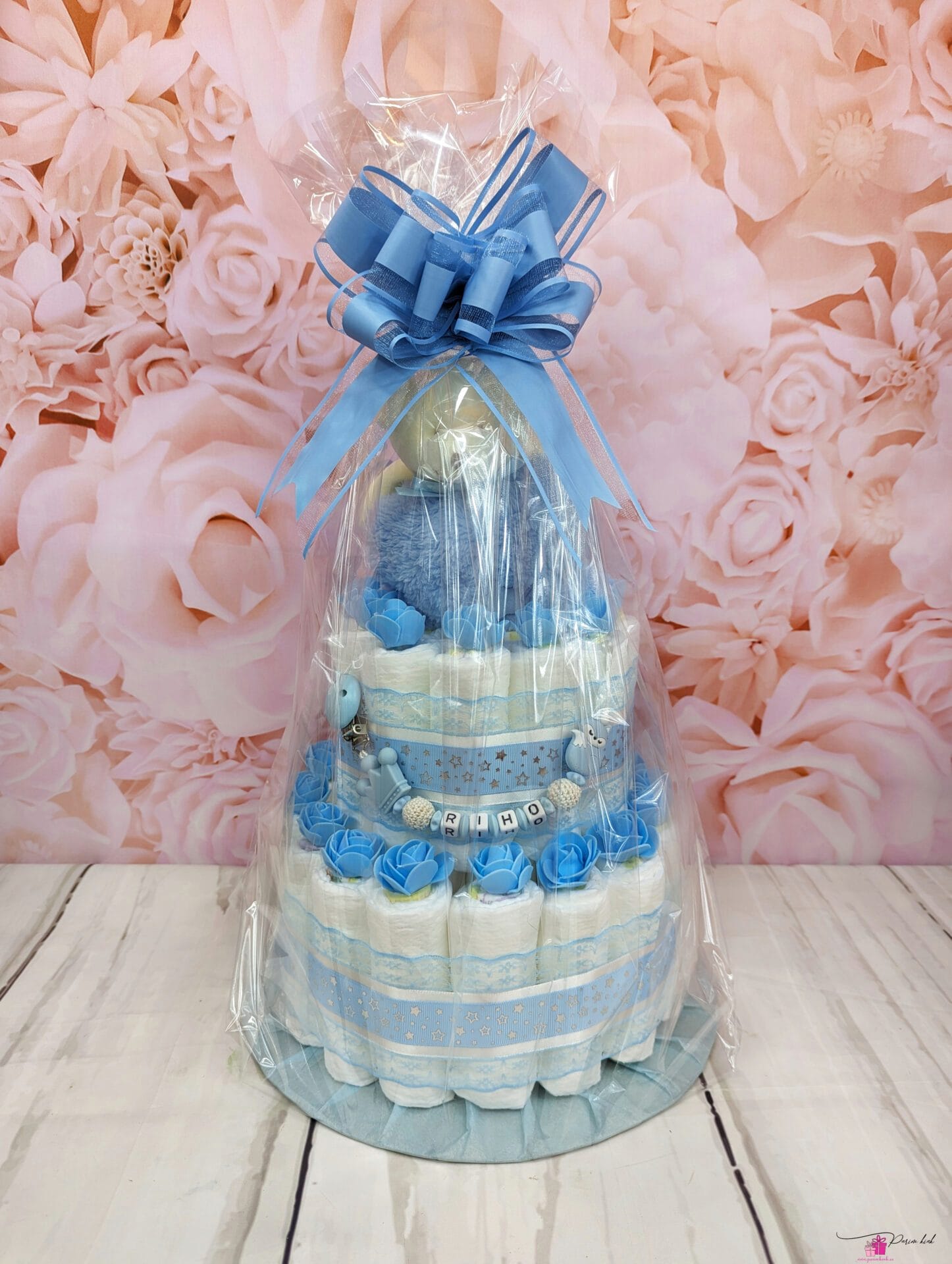 Mähkmetort on valmistatud 45-st mähkmest, pakitud tsellofaani ning kaunistatud suure rosetiga.
