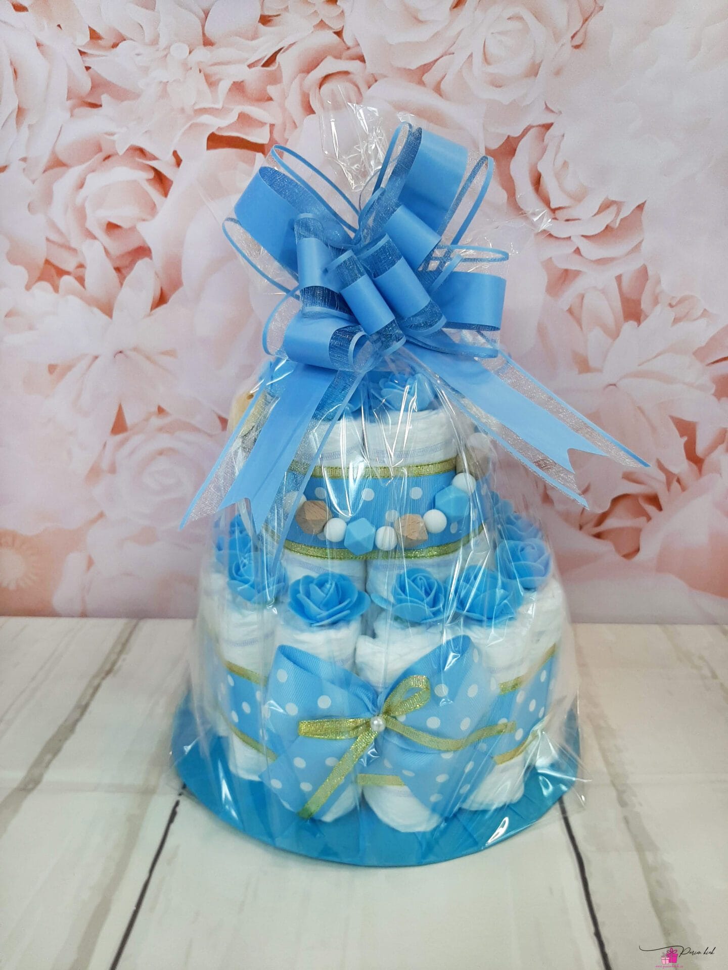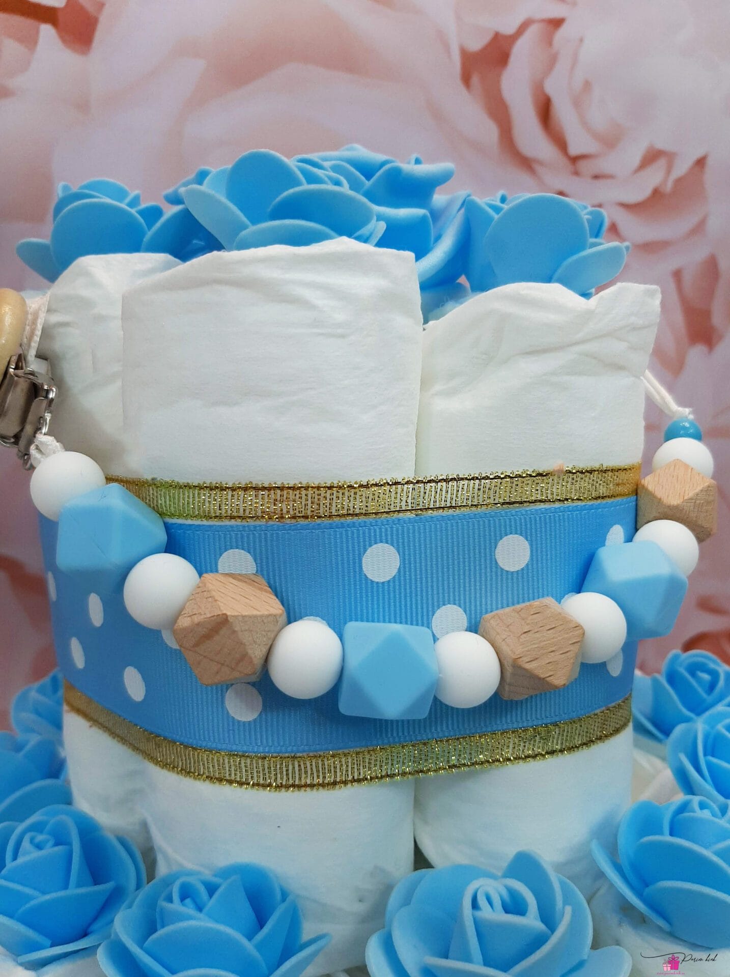 Mähkmetort on valmistatud 25-st mähkmest, pakitud tsellofaani ning kaunistatud suure rosetiga.