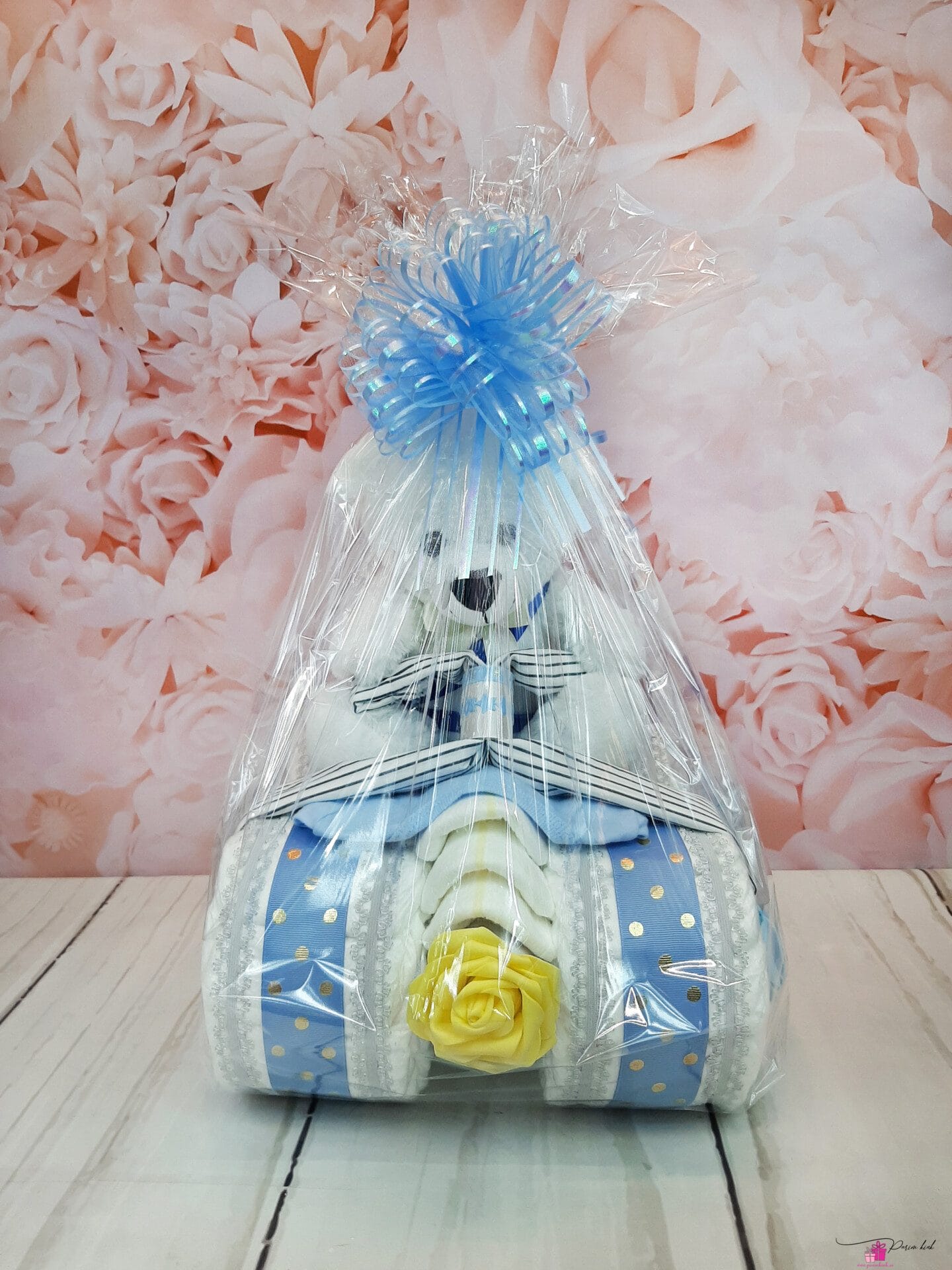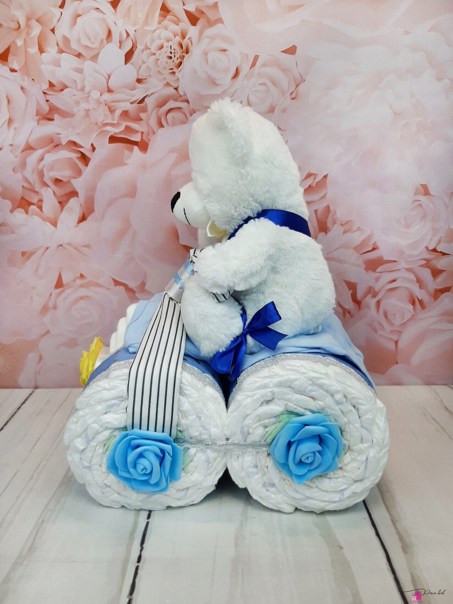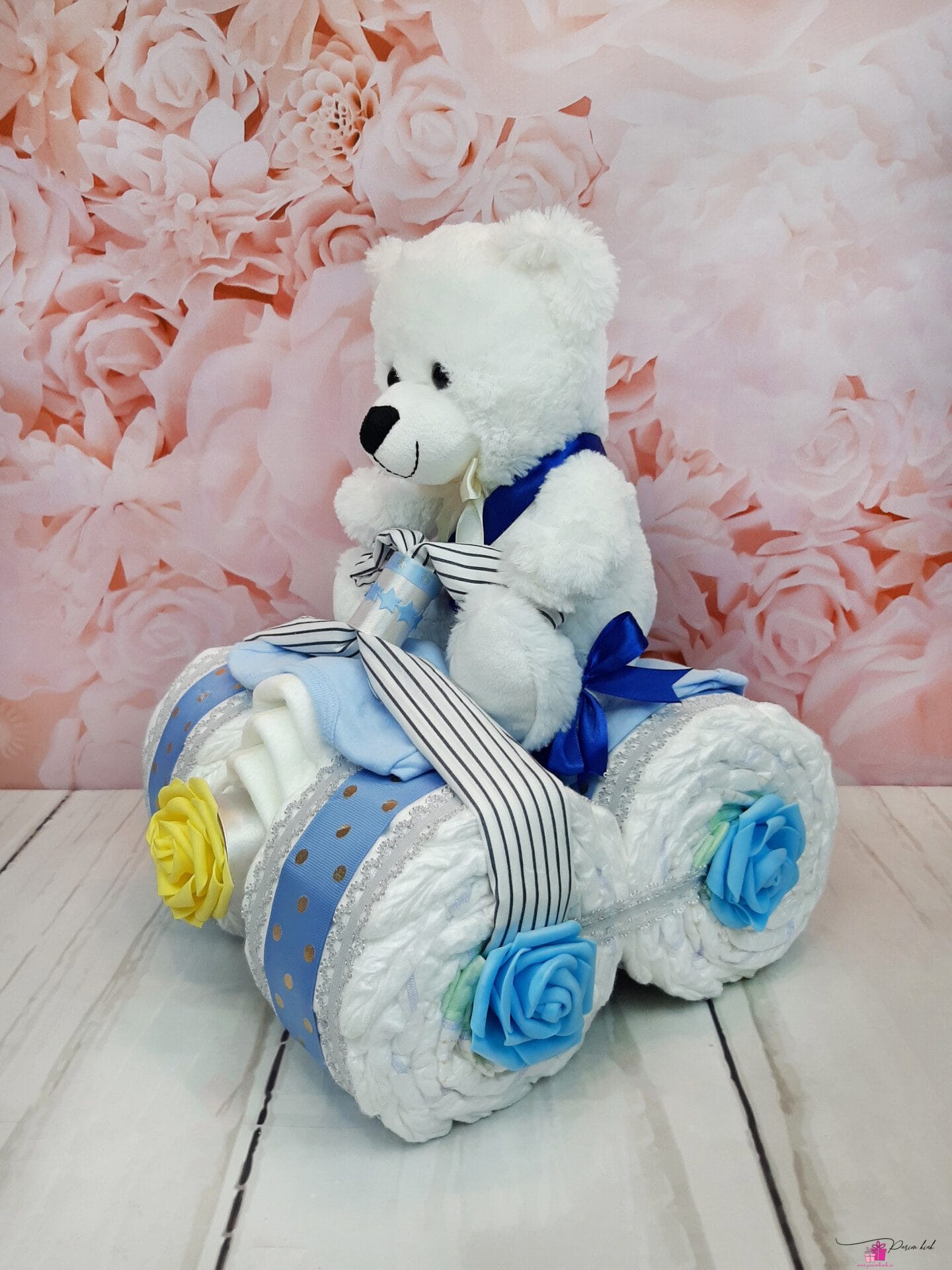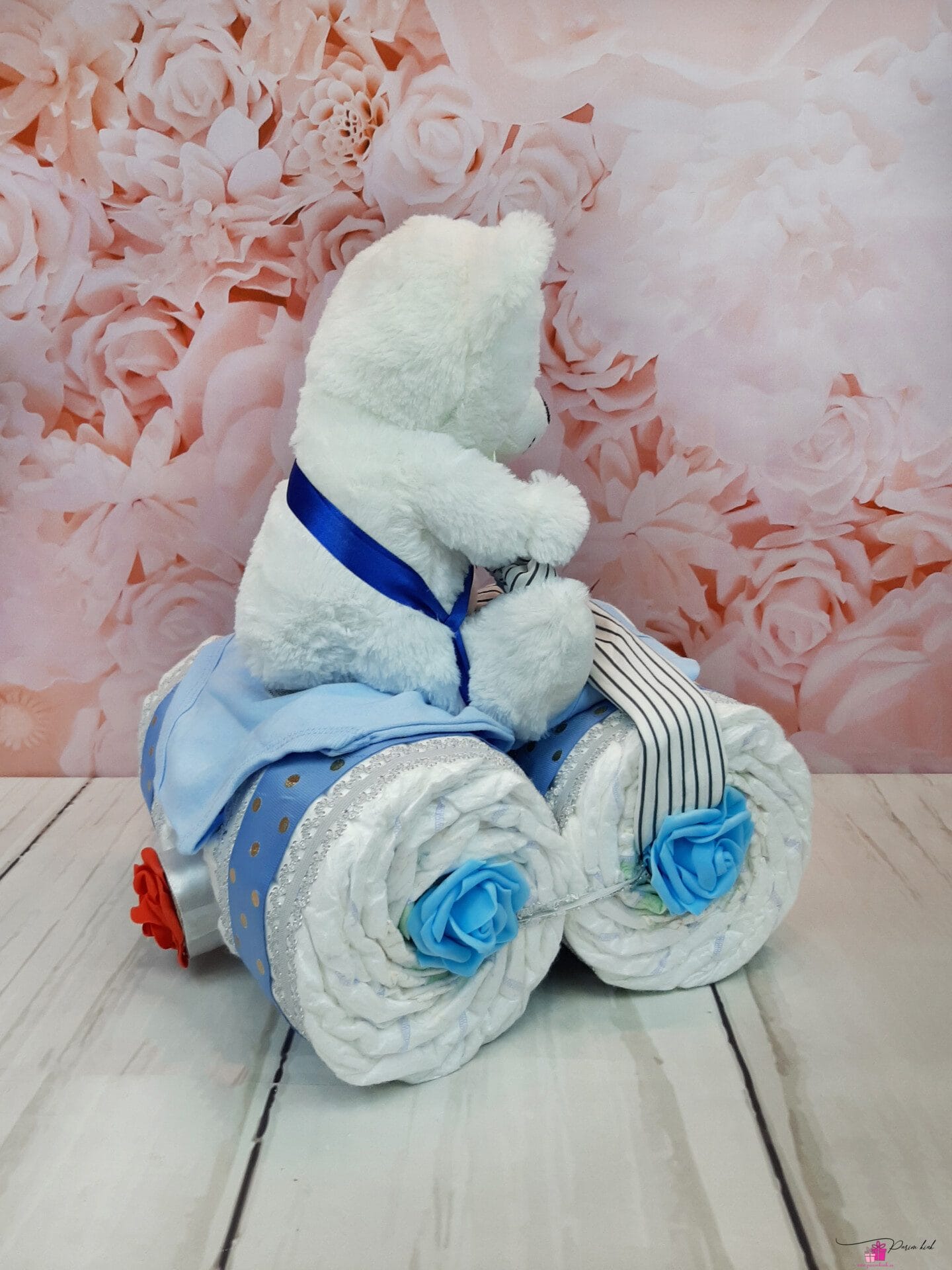 Mähkmetort on valmistatud 43-st mähkmest, pakitud tsellofaani ning kaunistatud suure rosetiga.