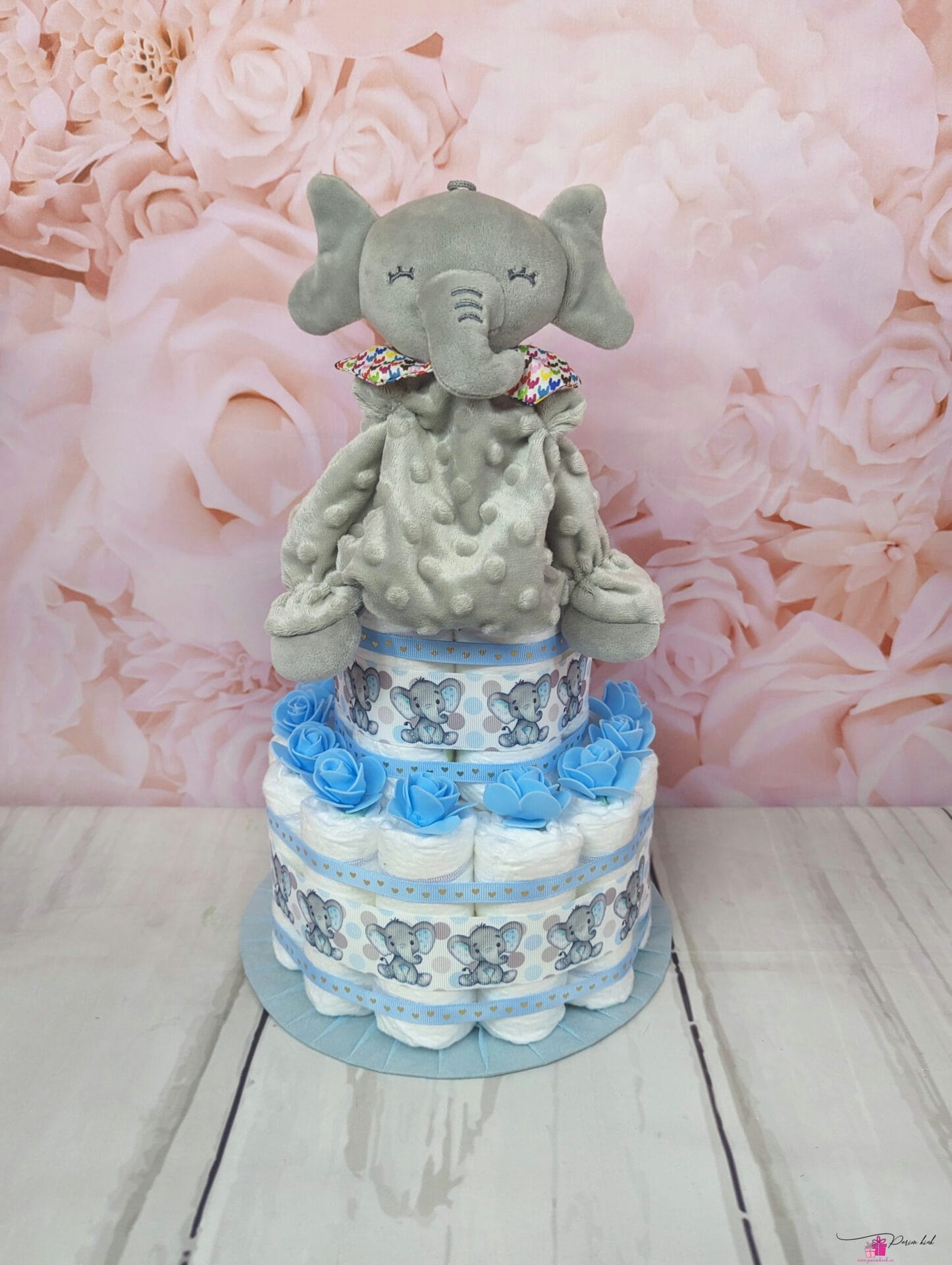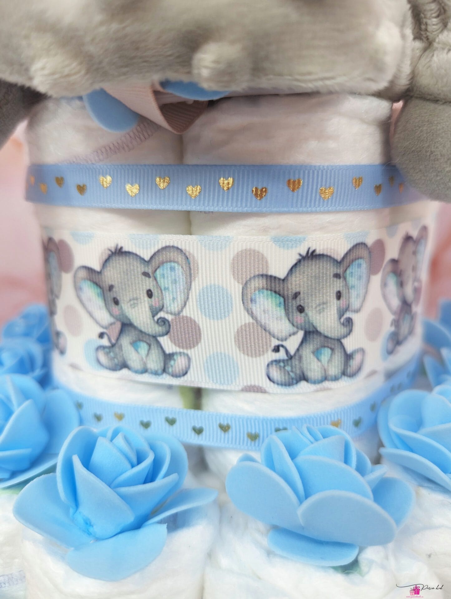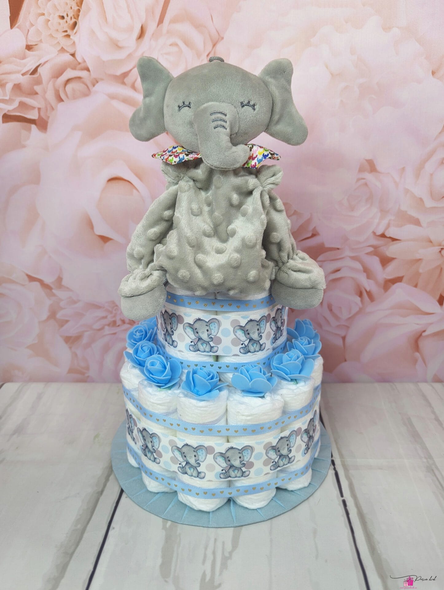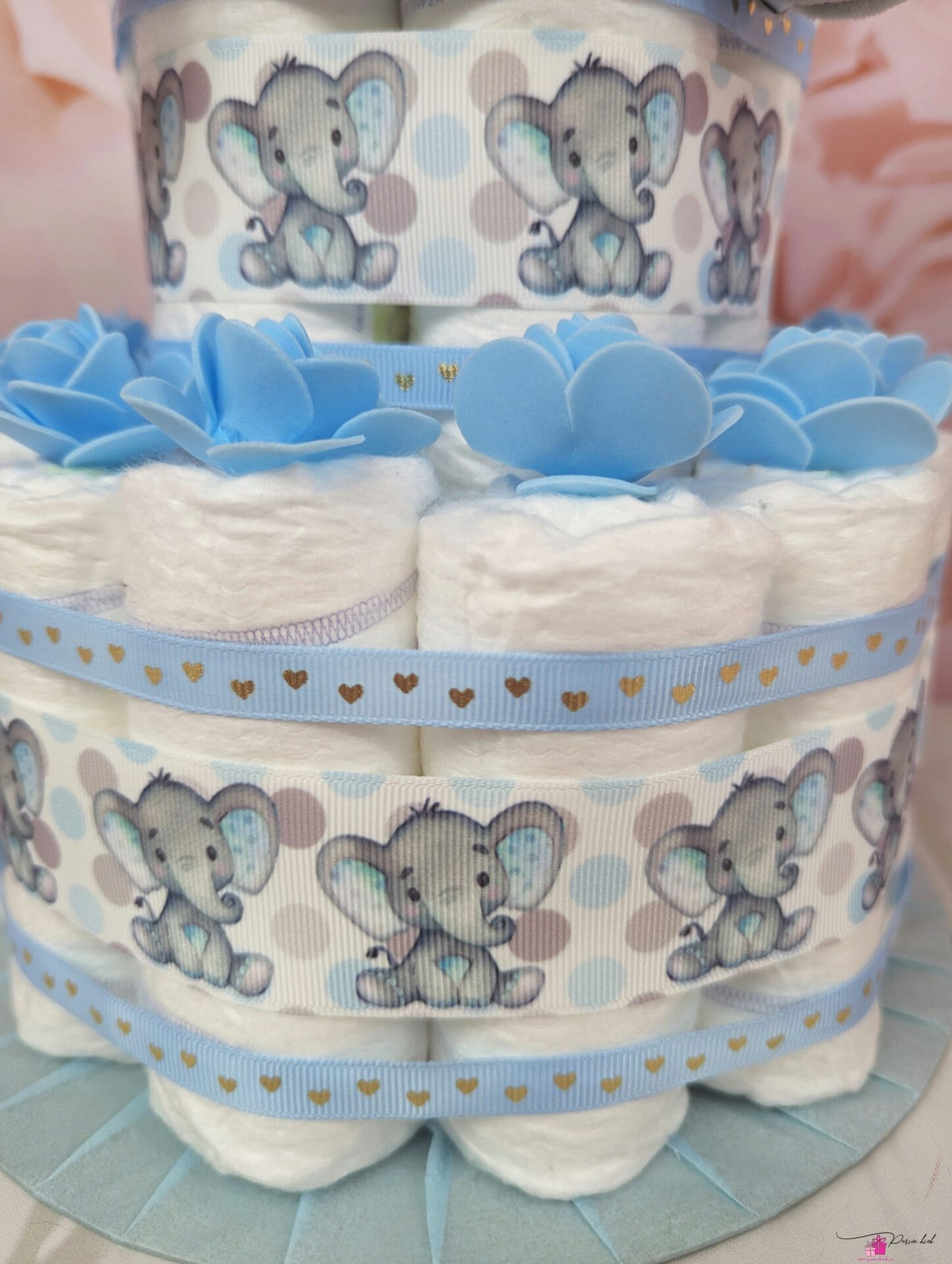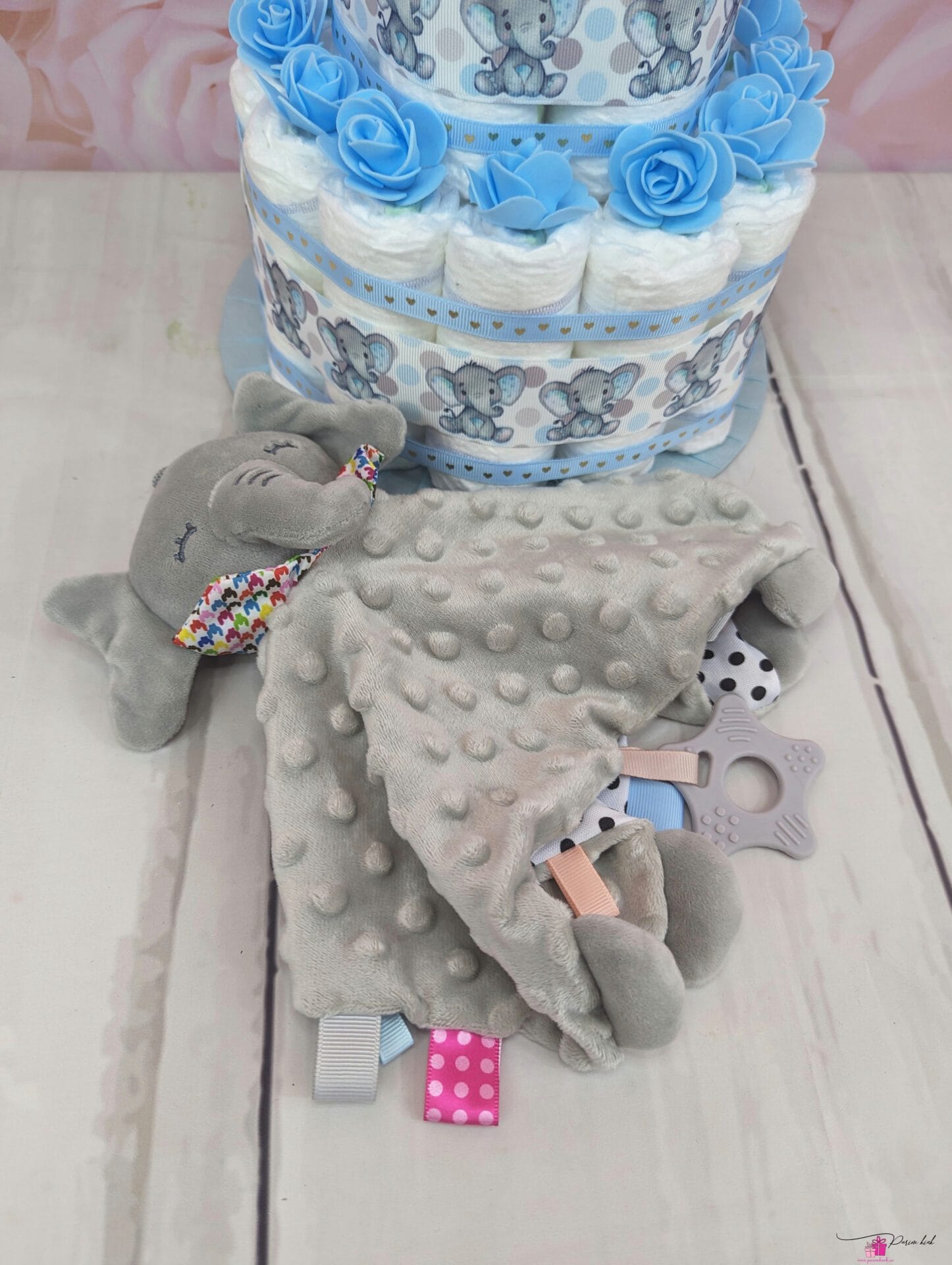 Mähkmetort on valmistatud 25-st mähkmest, pakitud tsellofaani ning kaunistatud suure rosetiga.