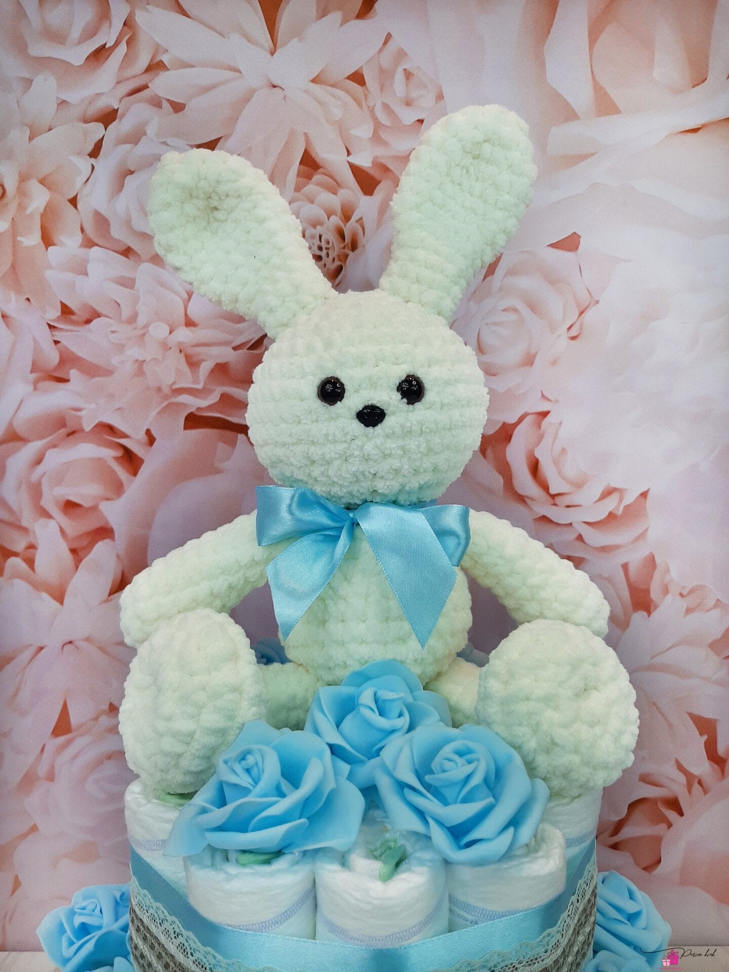 Sinine mähkmetort, mille otsas on meie enda käsitööna heegeldatud amigurumi jänes. Nii pehme ja nii mõnus, et sellest jänkust saab kindlasti beebi lemmik kaisukas!