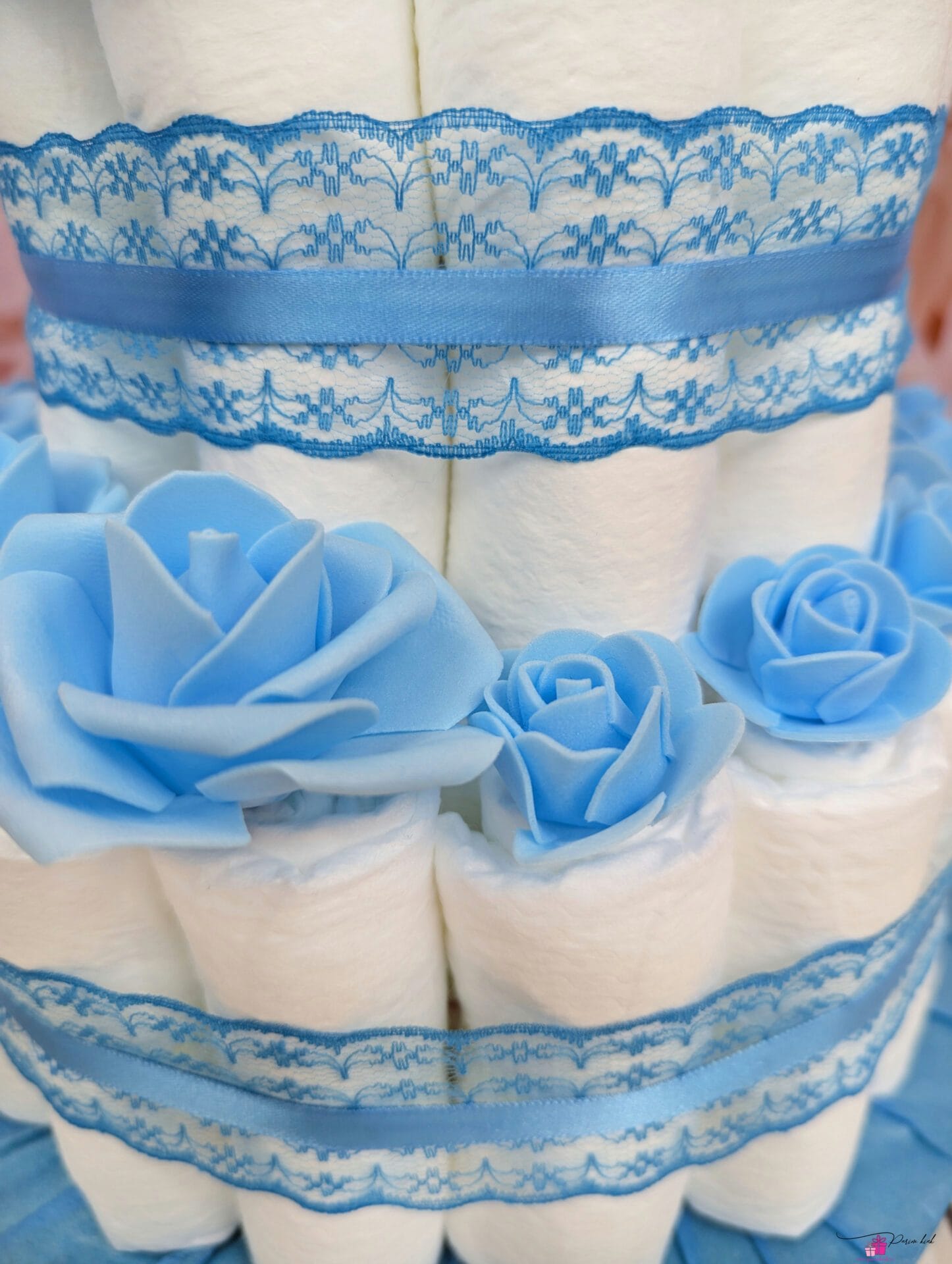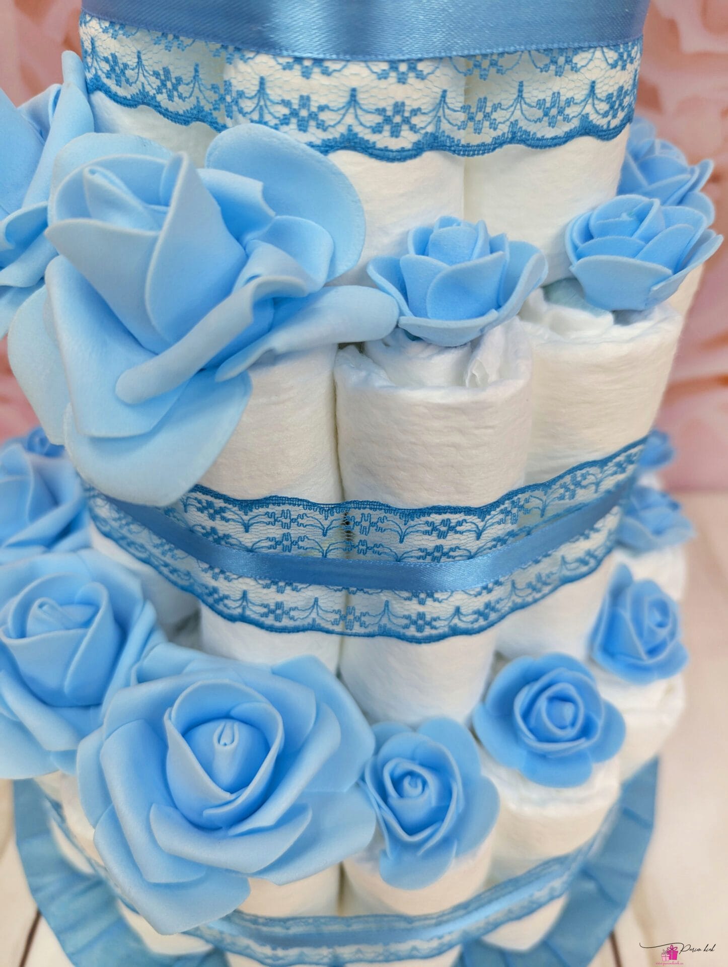 Mähkmetort on valmistatud 55-st mähkmest, pakitud tsellofaani ning kaunistatud suure rosetiga.