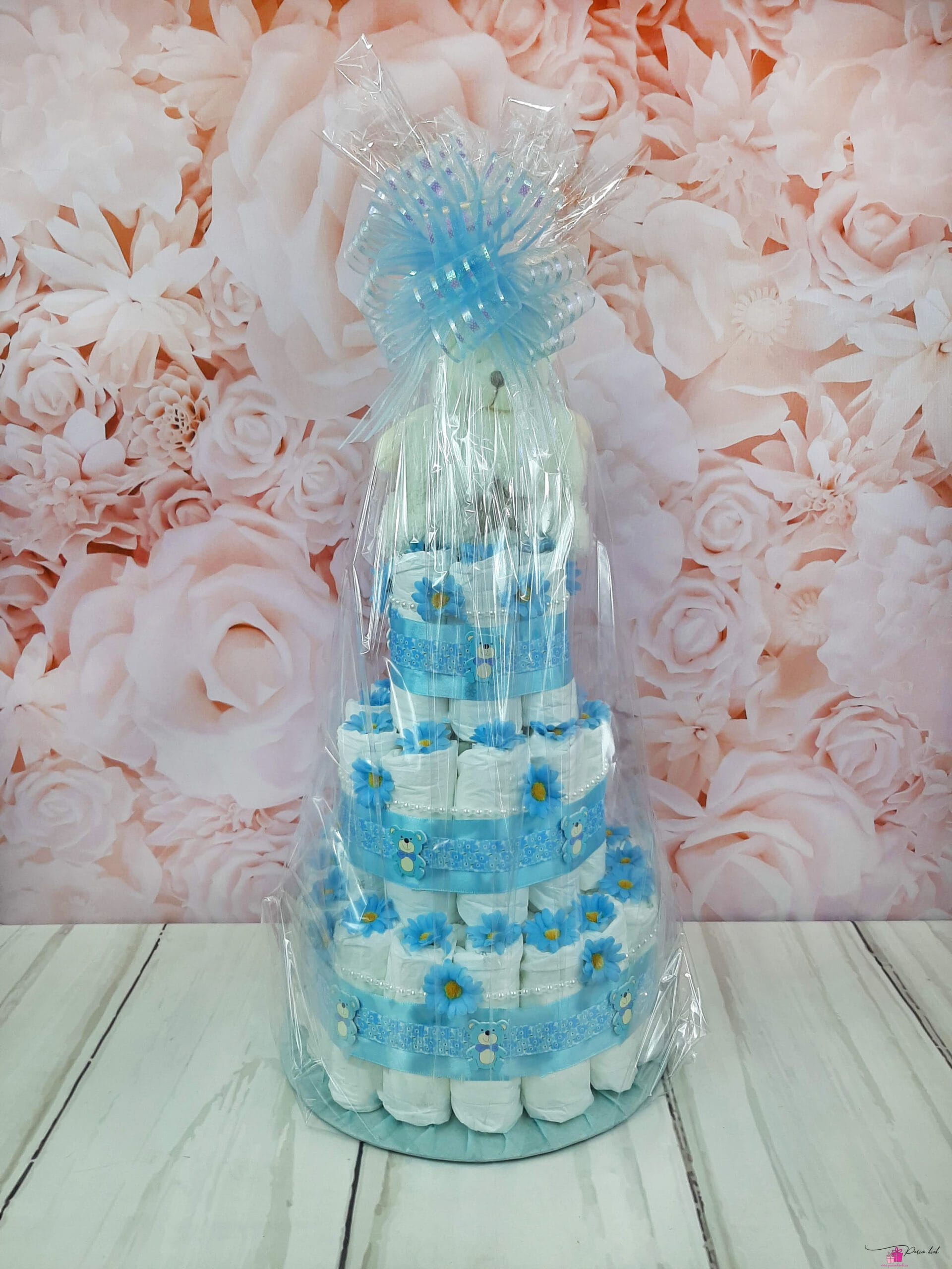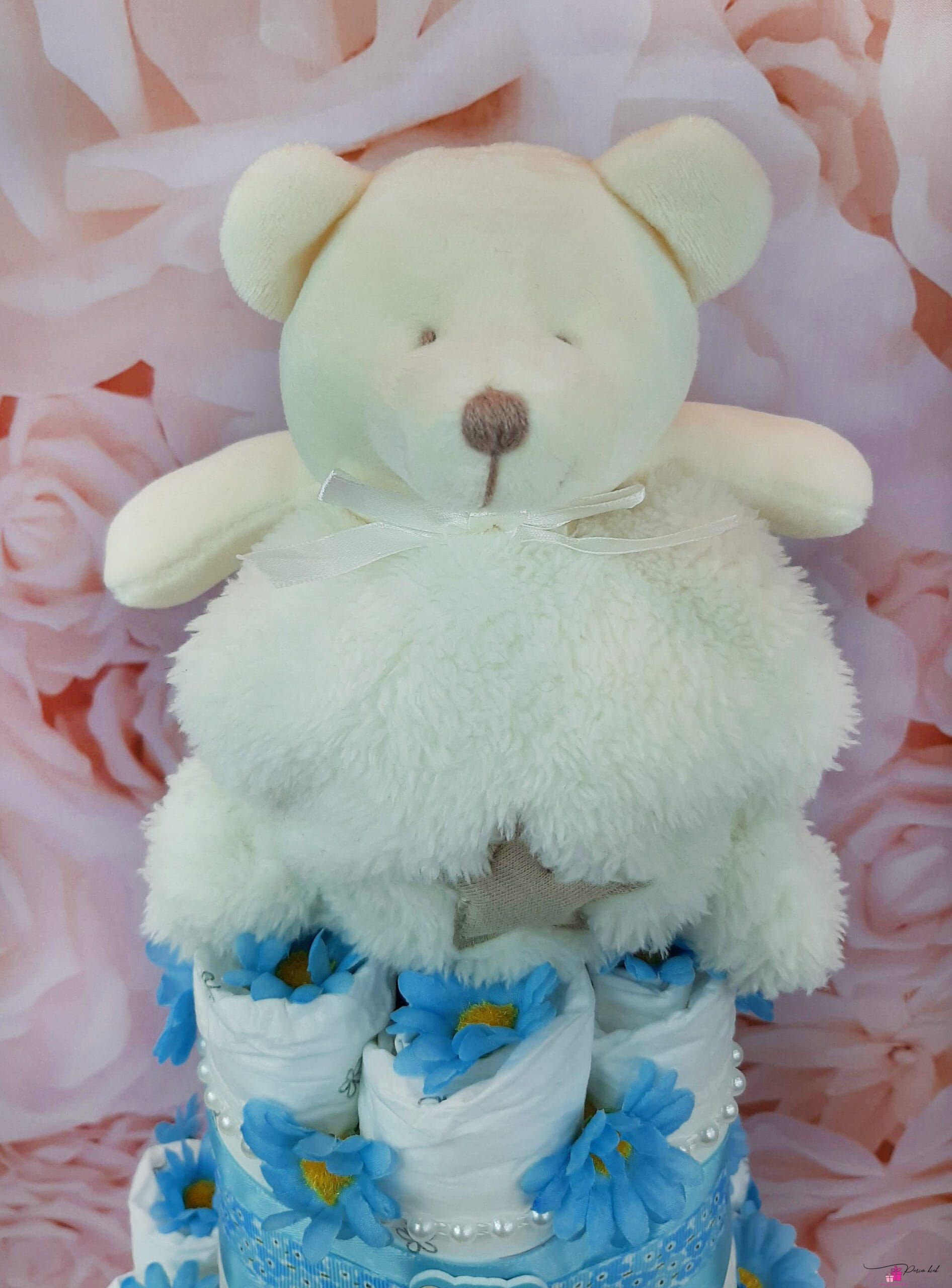 Mähkmetort on valmistatud 55-st mähkmest, pakitud tsellofaani ning kaunistatud suure rosetiga.