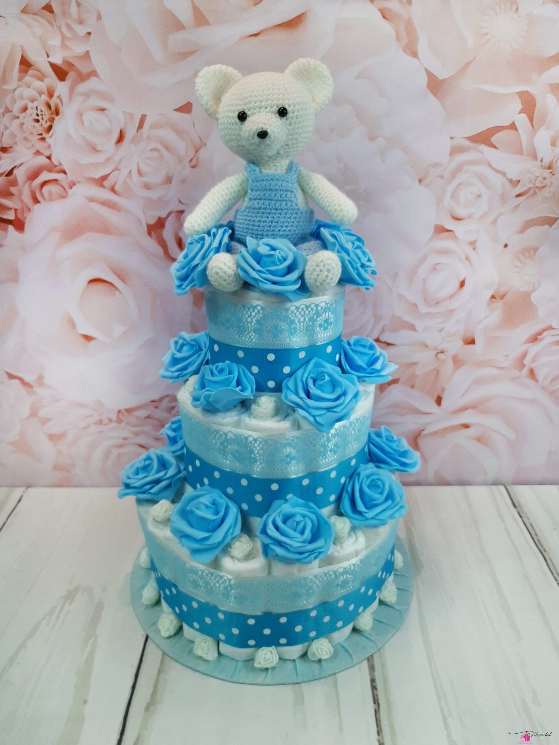 Mähkmetort on valmistatud 55-st mähkmest, pakitud tsellofaani ning kaunistatud suure rosetiga.