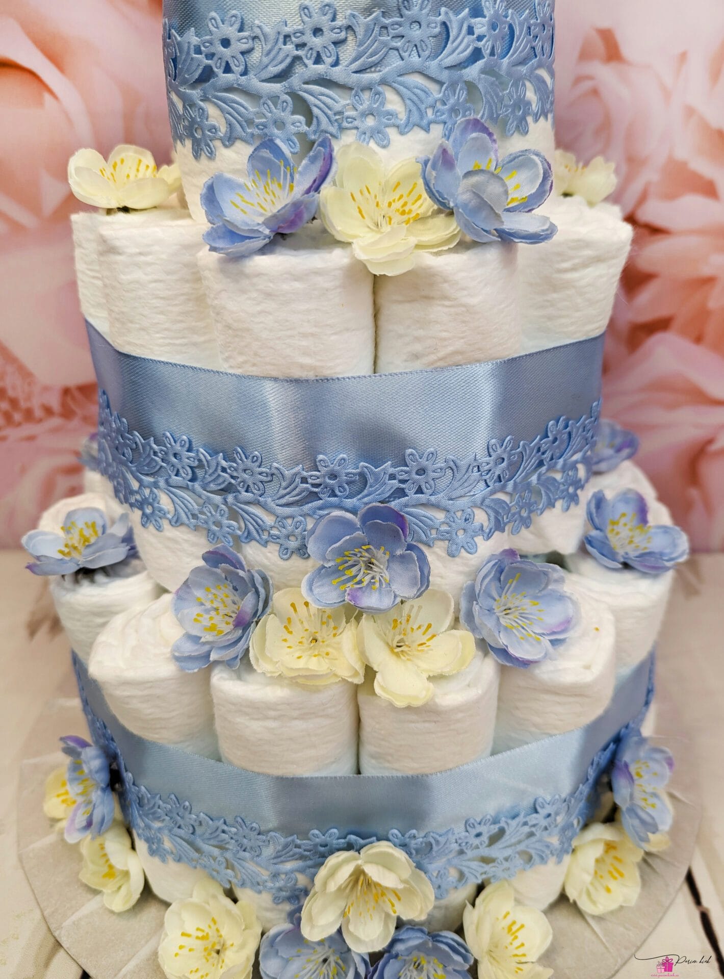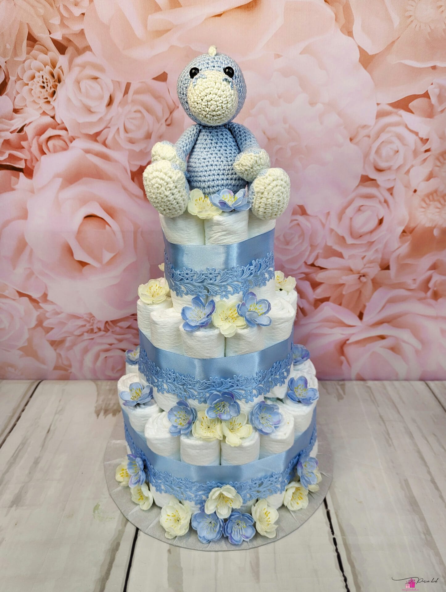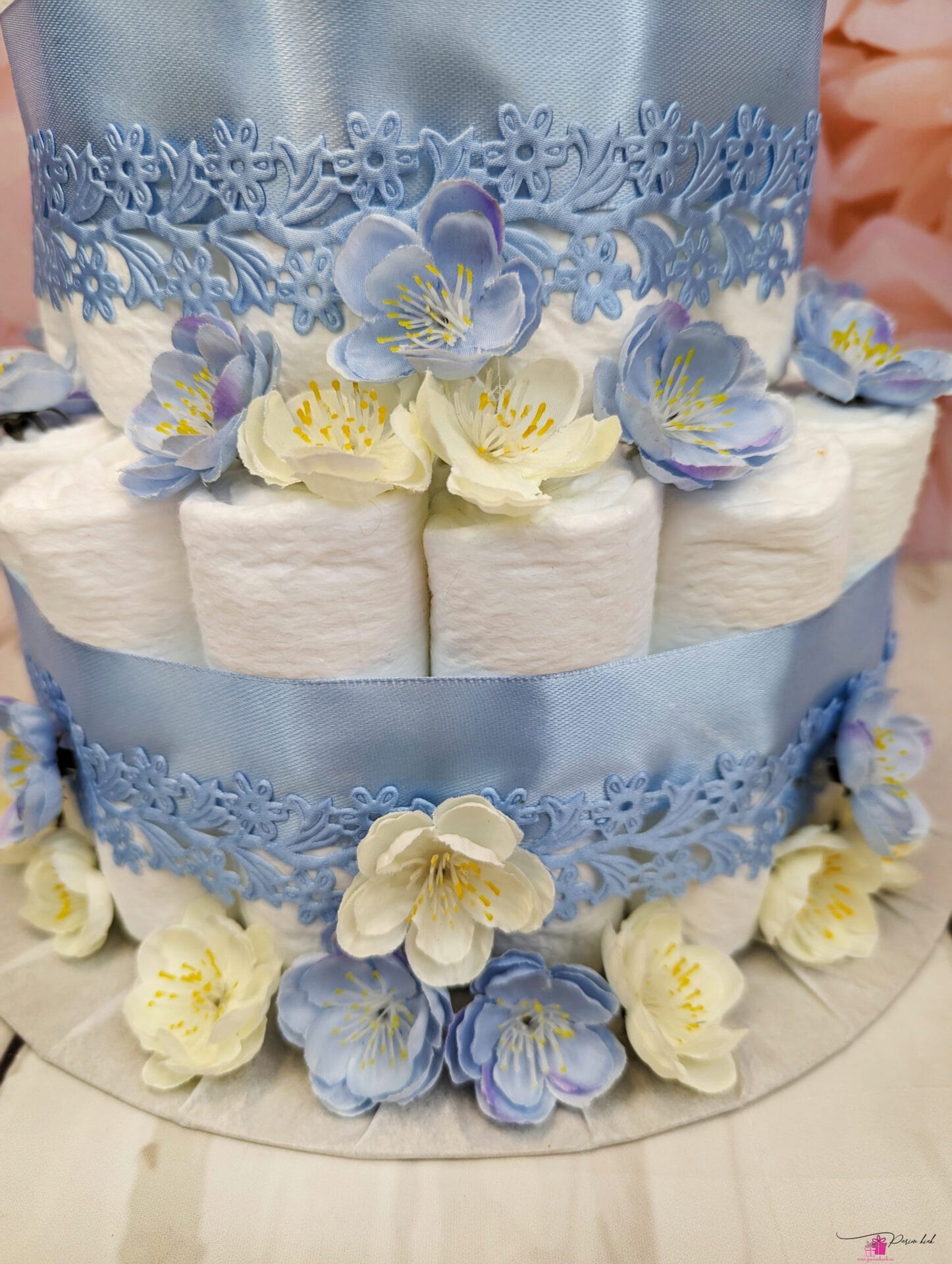 Mähkmetort on valmistatud 55-st mähkmest, pakitud tsellofaani ning kaunistatud suure rosetiga.