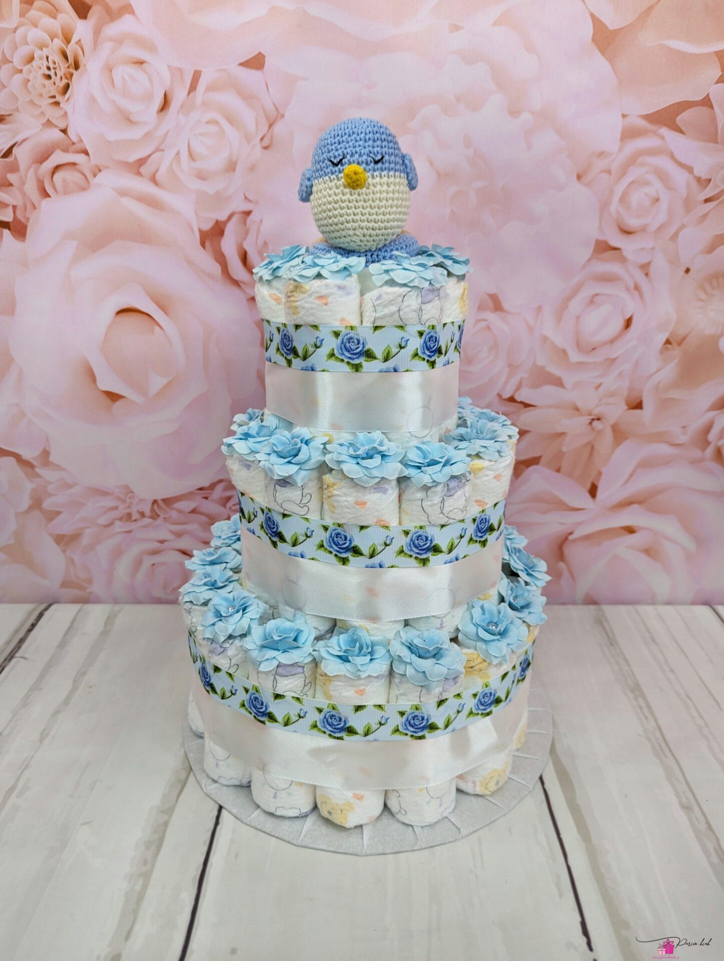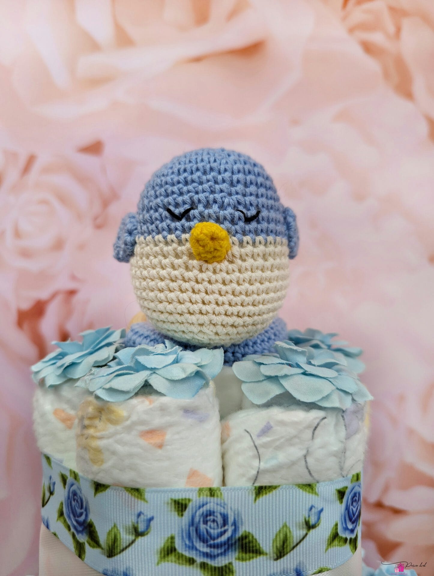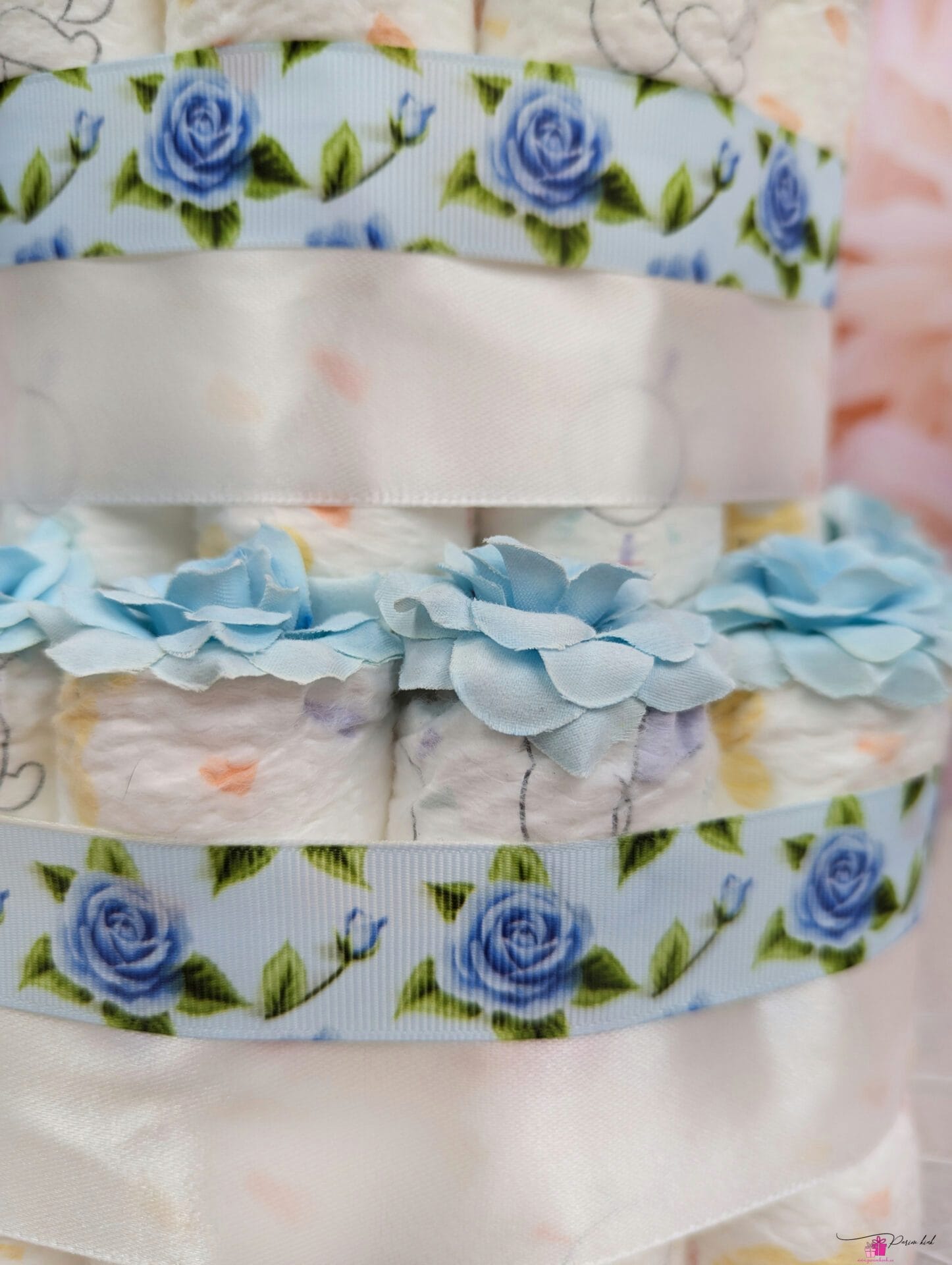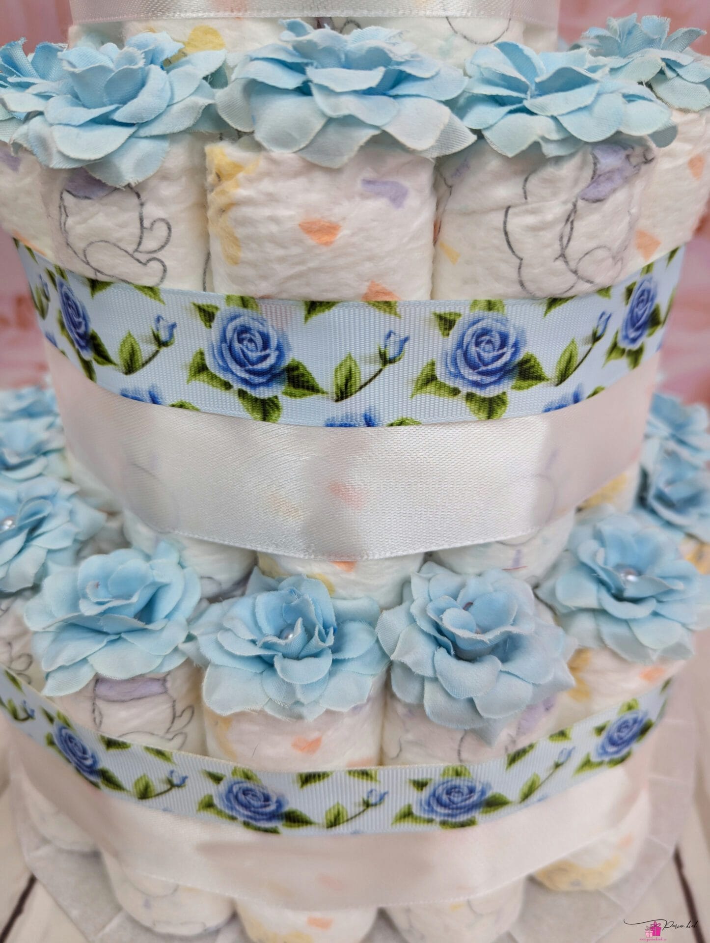 Mähkmetort on valmistatud 55-st mähkmest, pakitud tsellofaani ning kaunistatud suure rosetiga.