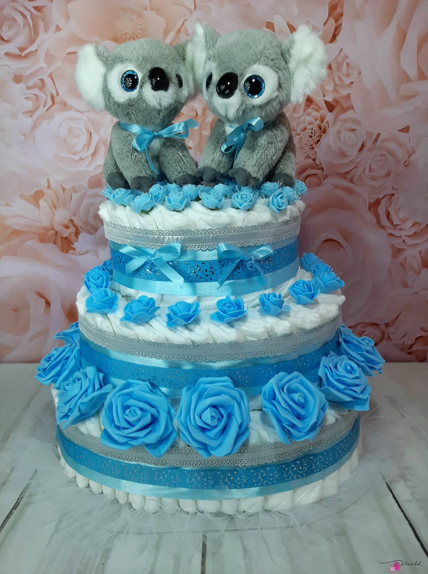 Kaksikute sünd on eriline! Mis saaks olla vanematele parem kingitus, kui tort, mis on valmistatud mähkmetest. Beebidele toovad rõõmu uued parimad sõbrad, koaalad!
