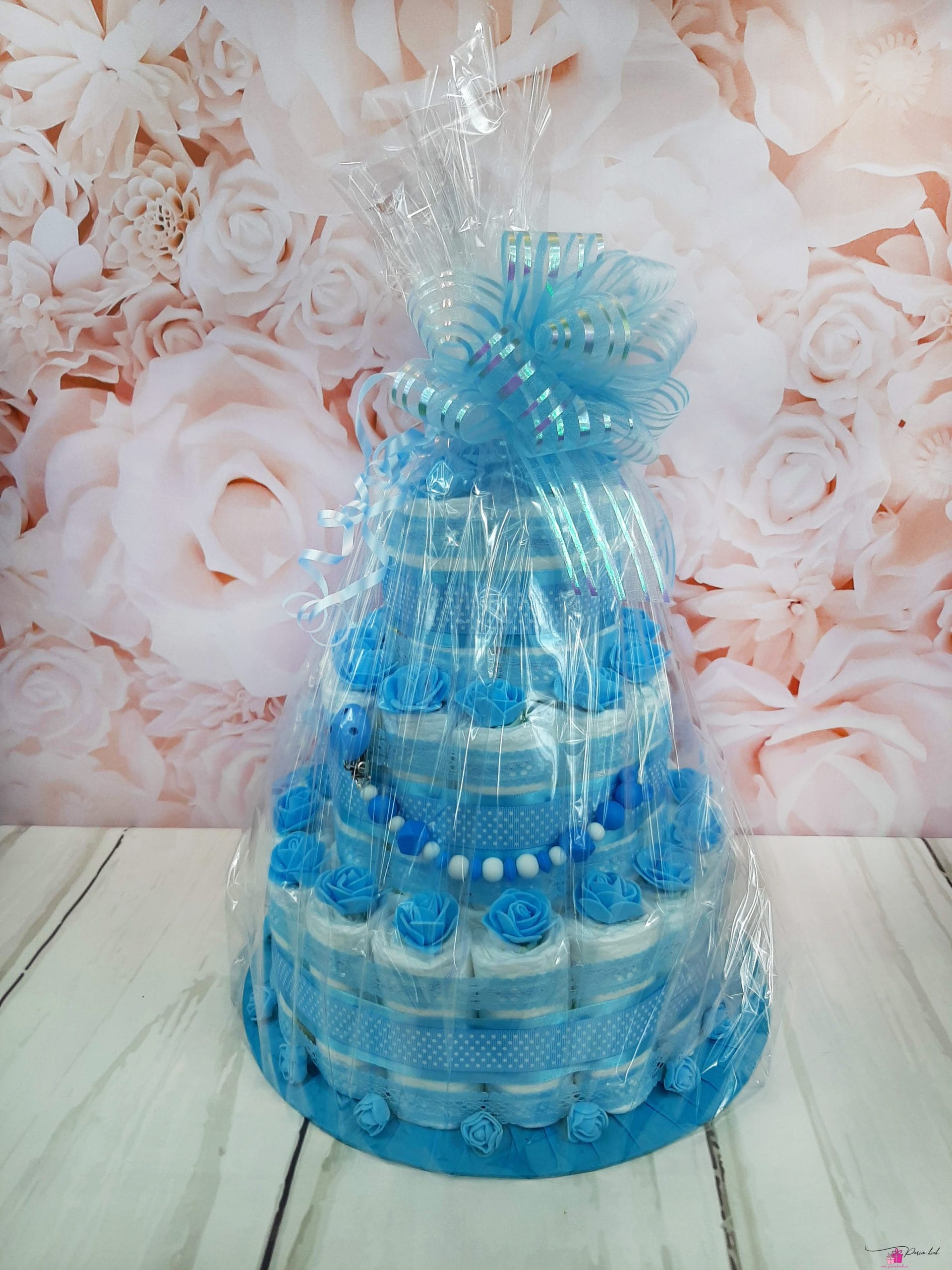 Mähkmetort on valmistatud 55-st mähkmest, pakitud tsellofaani ning kaunistatud suure rosetiga.
