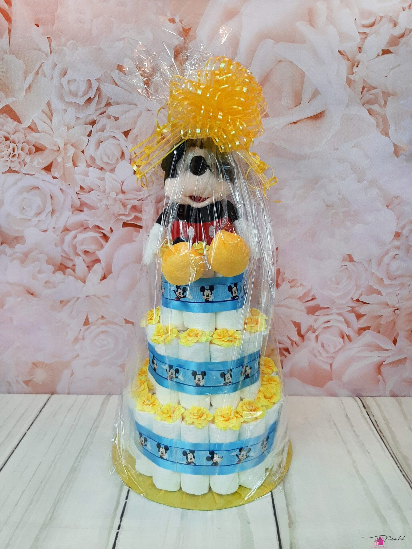 Mähkmetort on valmistatud 55-st mähkmest, pakitud tsellofaani ning kaunistatud suure rosetiga.