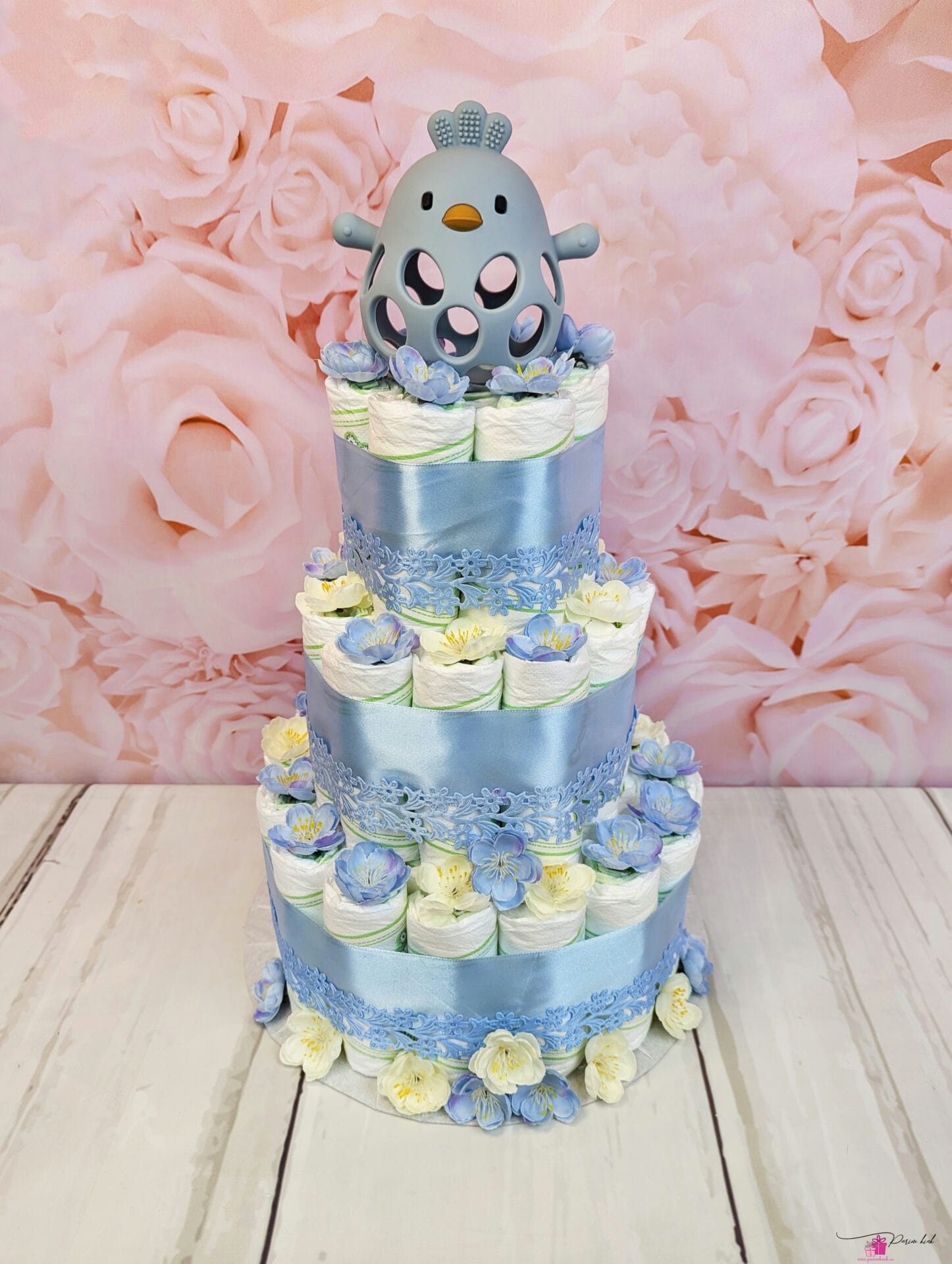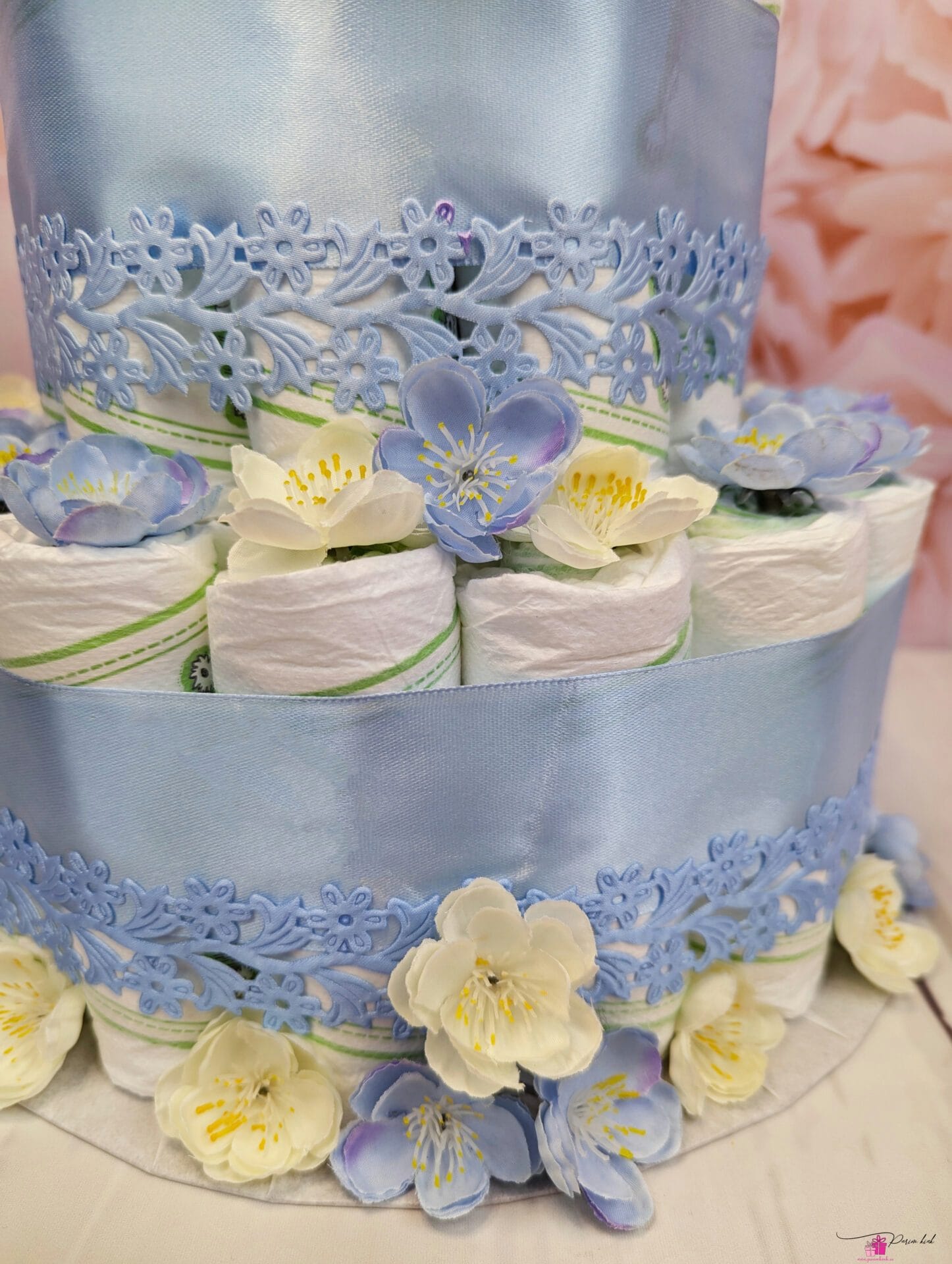 Mähkmetort on valmistatud 55-st mähkmest, pakitud tsellofaani ning kaunistatud suure rosetiga.