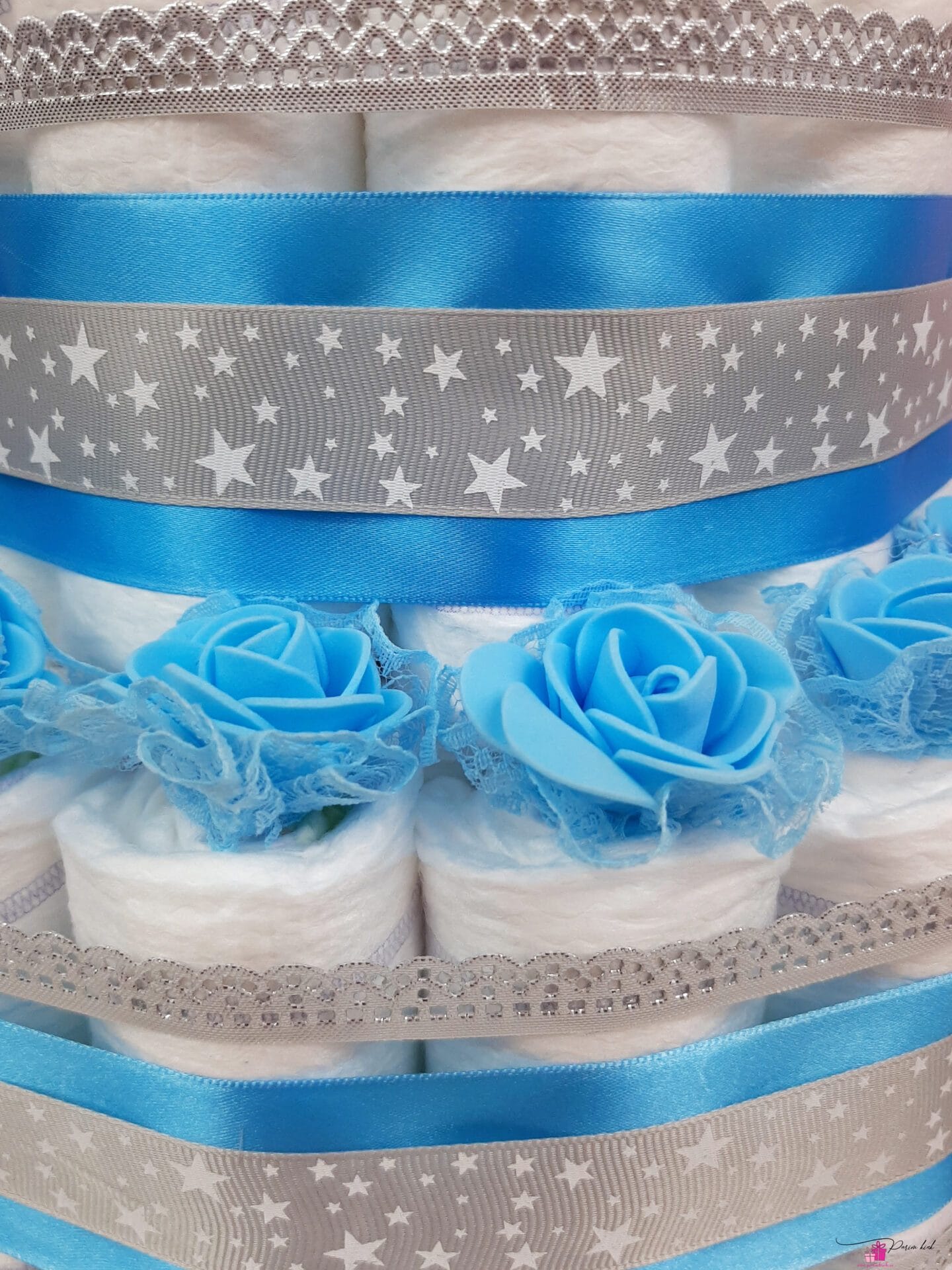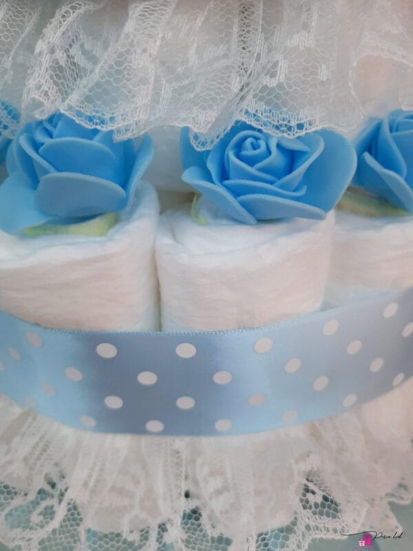 Mähkmetort on valmistatud 55-st mähkmest, pakitud tsellofaani ning kaunistatud suure rosetiga.