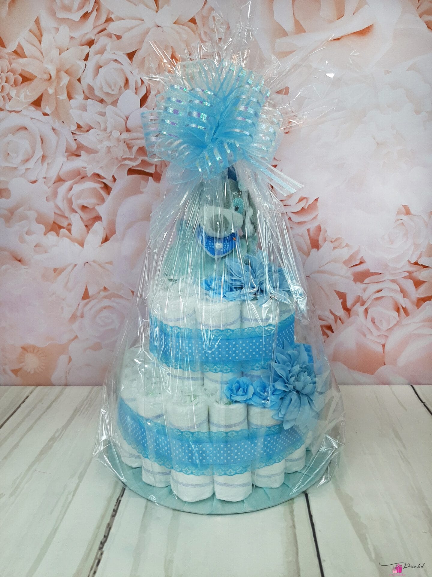 Mähkmetort on valmistatud 45-st mähkmest, pakitud tsellofaani ning kaunistatud suure rosetiga.