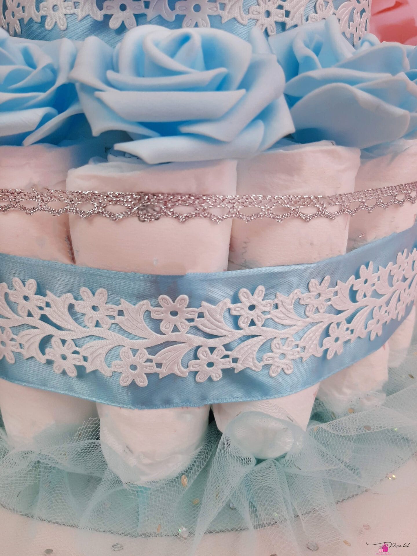 Mähkmetort on valmistatud 55-st mähkmest, pakitud tsellofaani ning kaunistatud suure rosetiga.