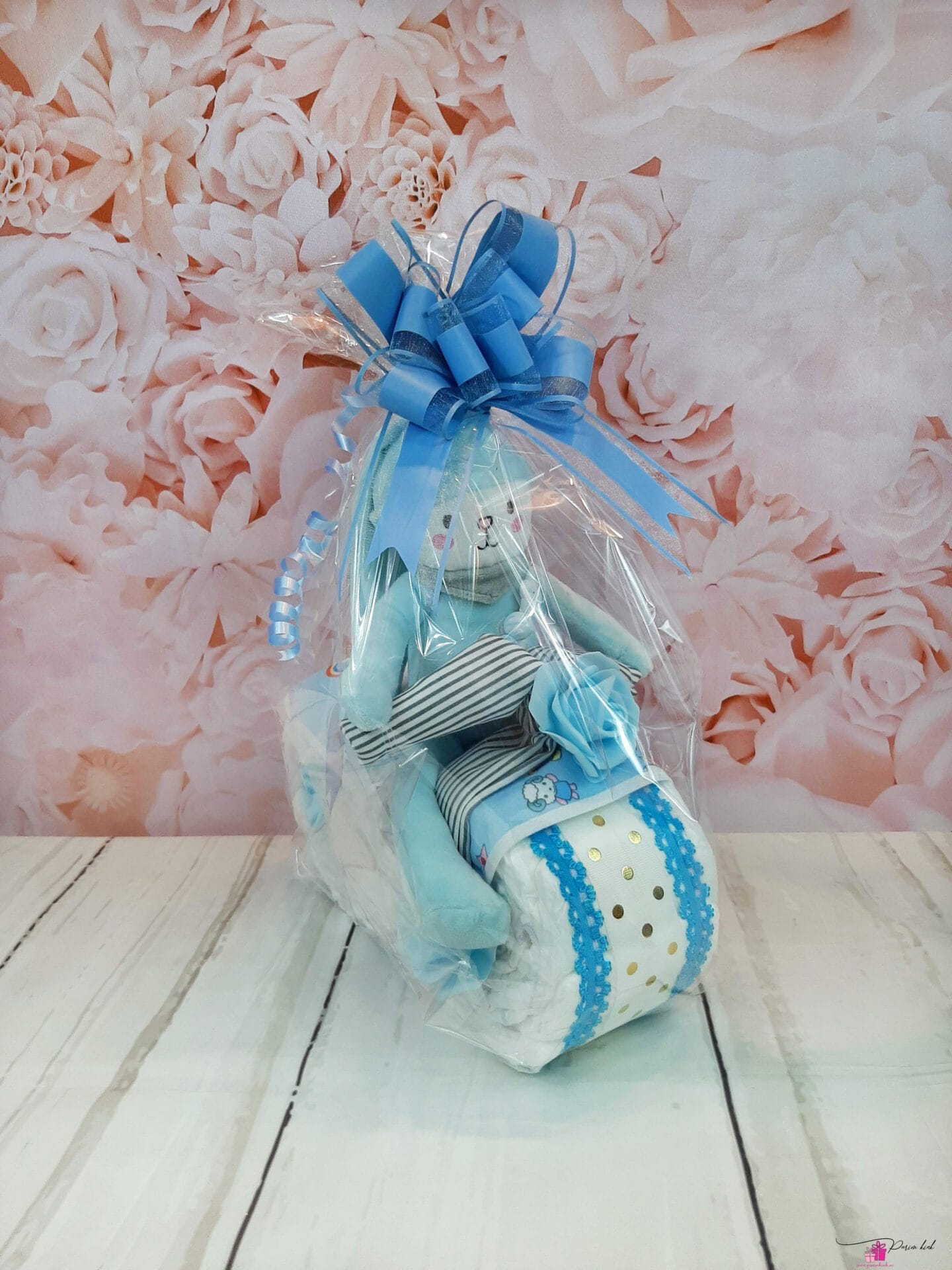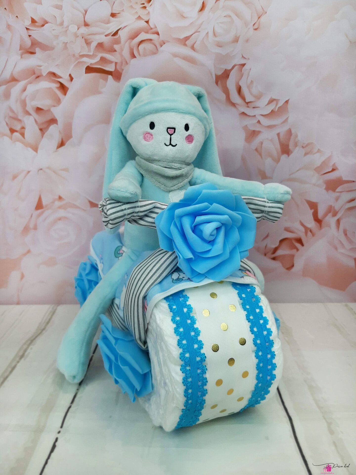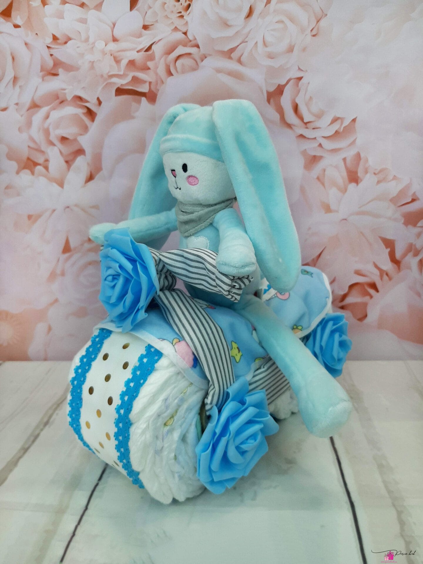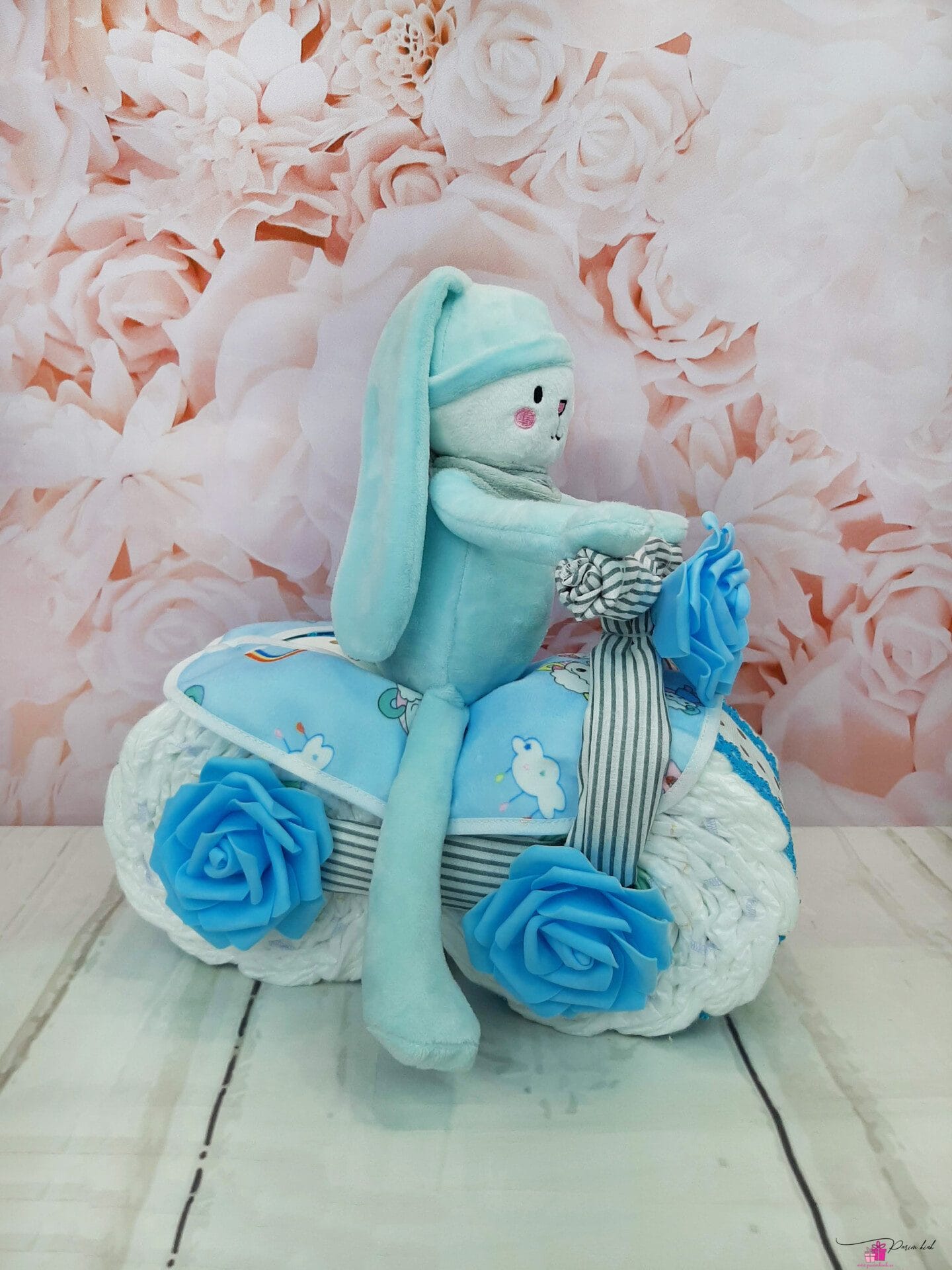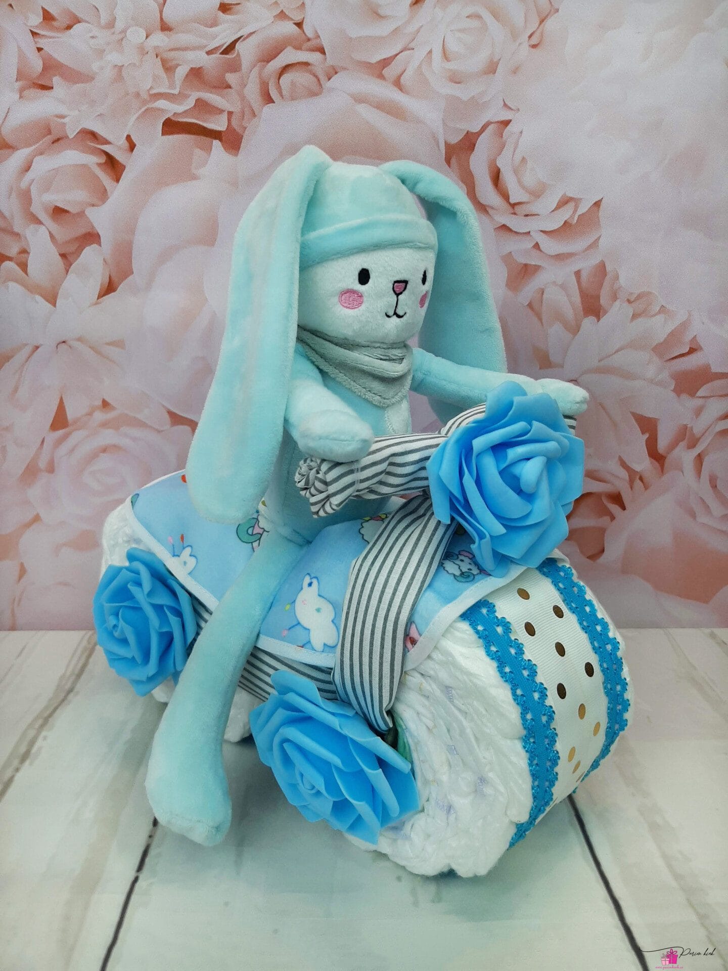 Mähkmetort on valmistatud 20-st mähkmest, pakitud tsellofaani ning kaunistatud suure rosetiga.