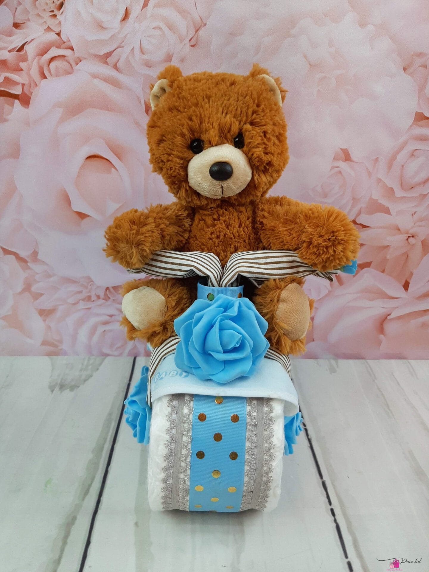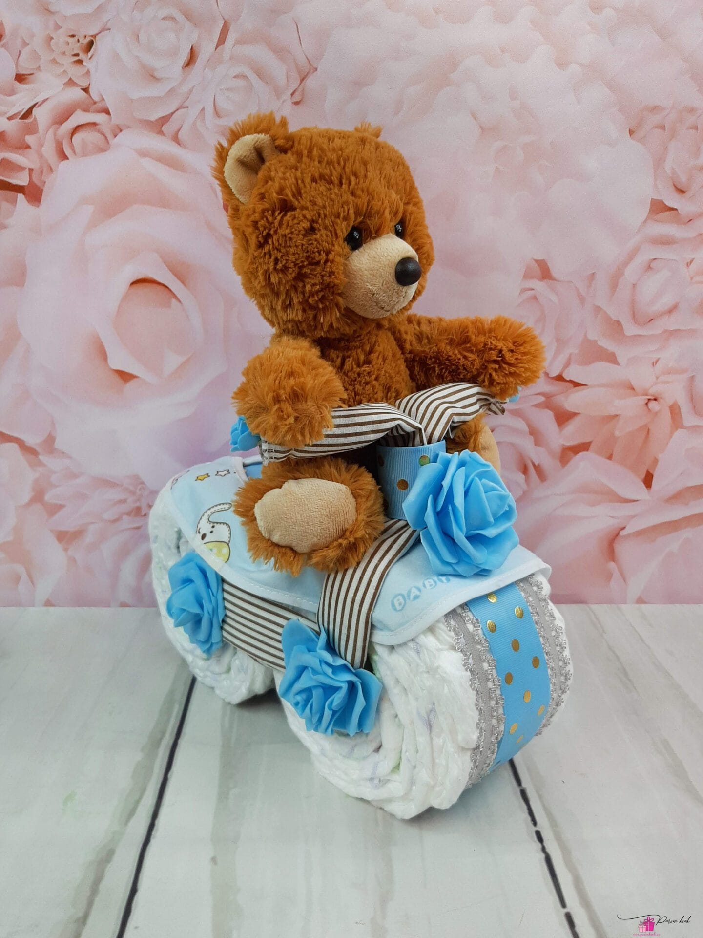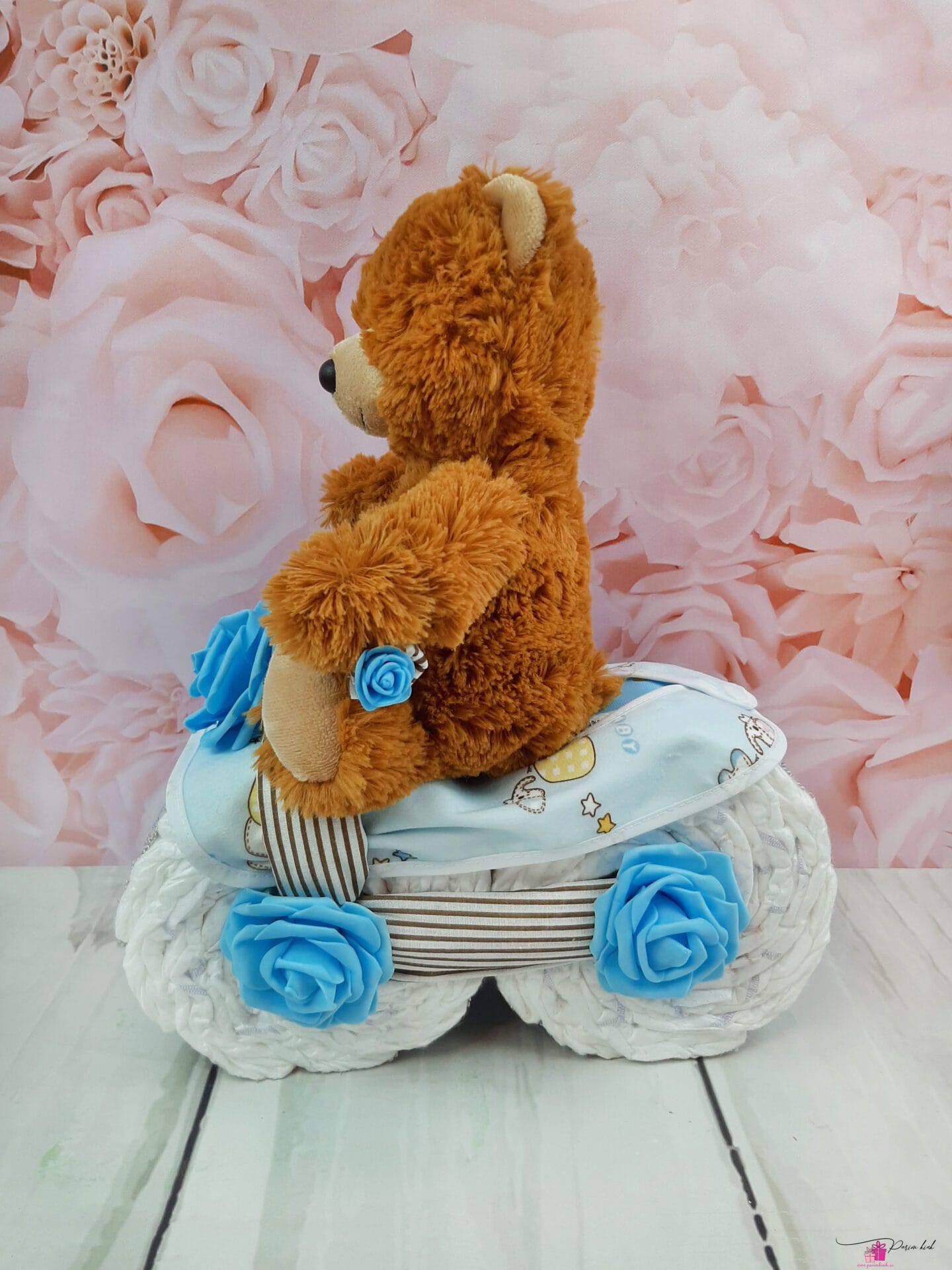 Mähkmetort on valmistatud 20-st mähkmest, pakitud tsellofaani ning kaunistatud suure rosetiga.