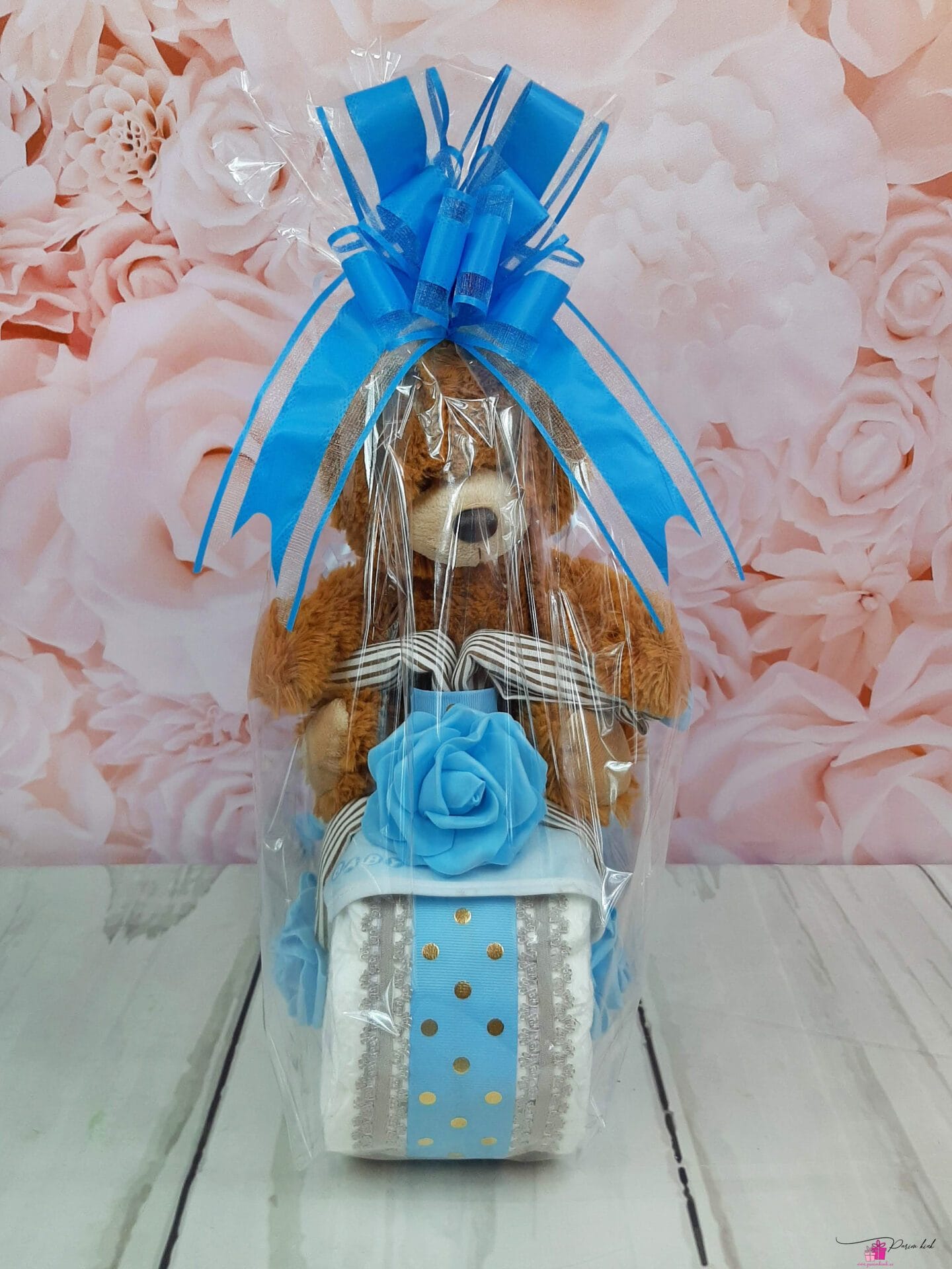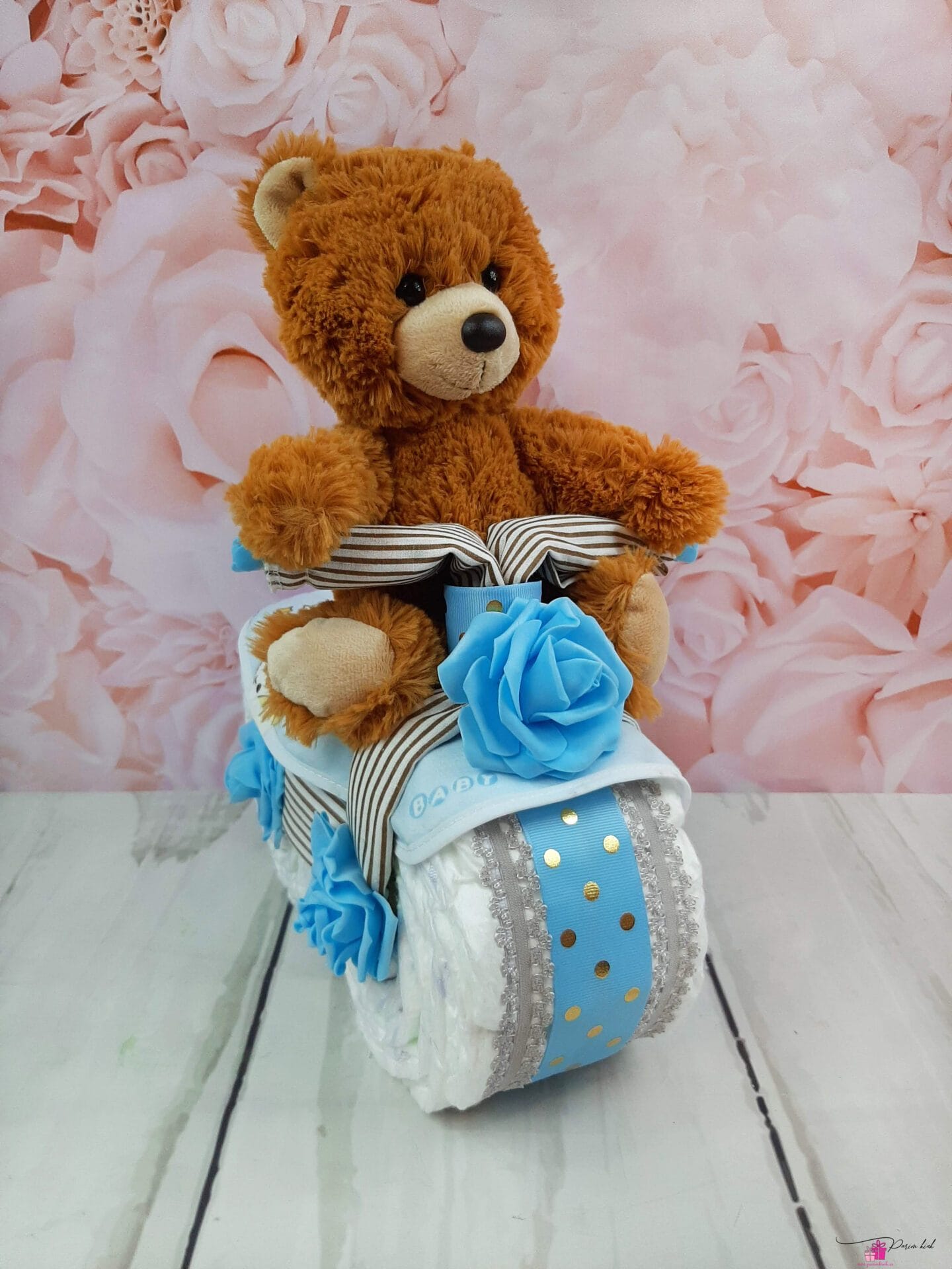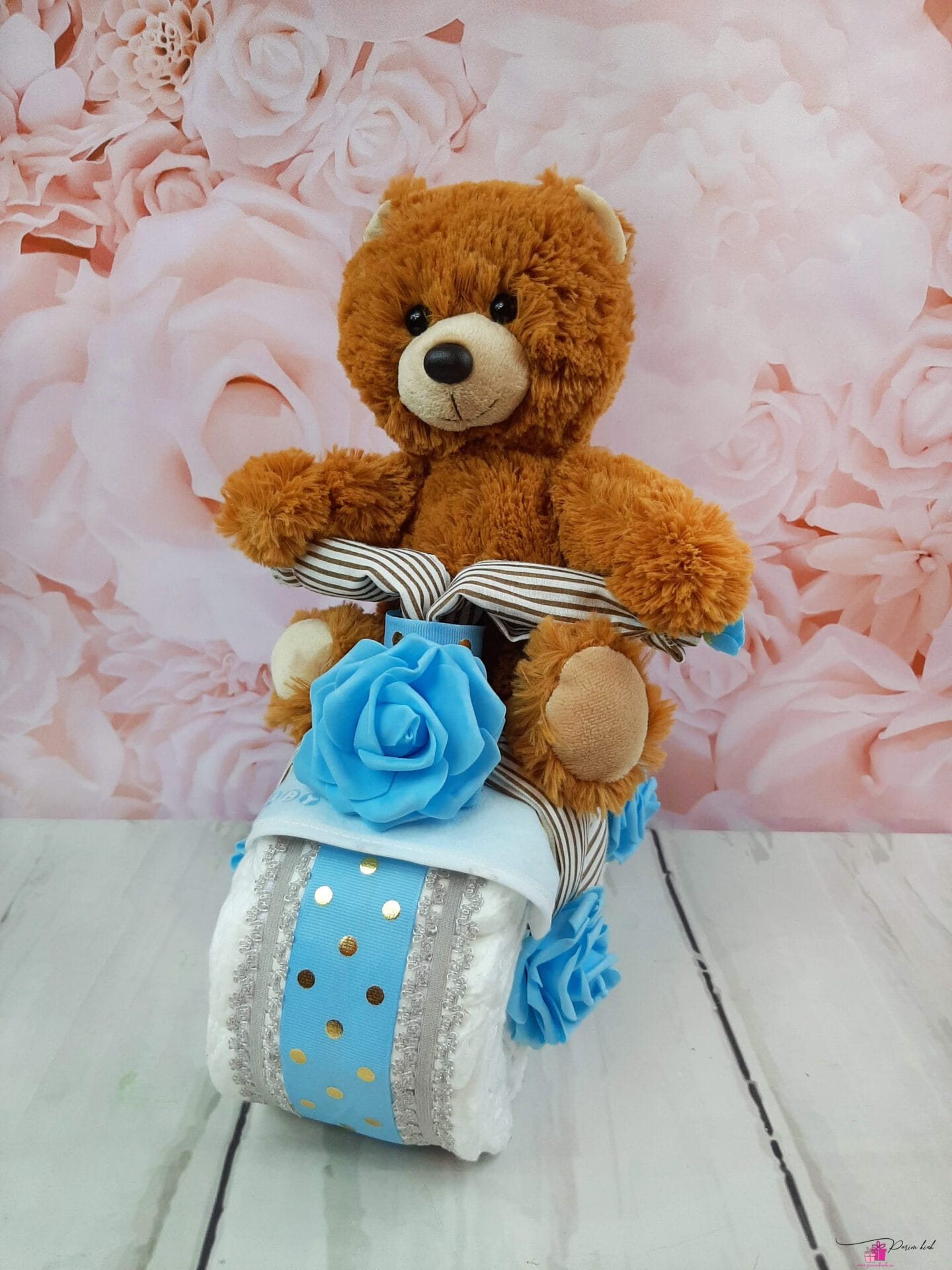 Mähkmetort on valmistatud 20-st mähkmest, pakitud tsellofaani ning kaunistatud suure rosetiga.