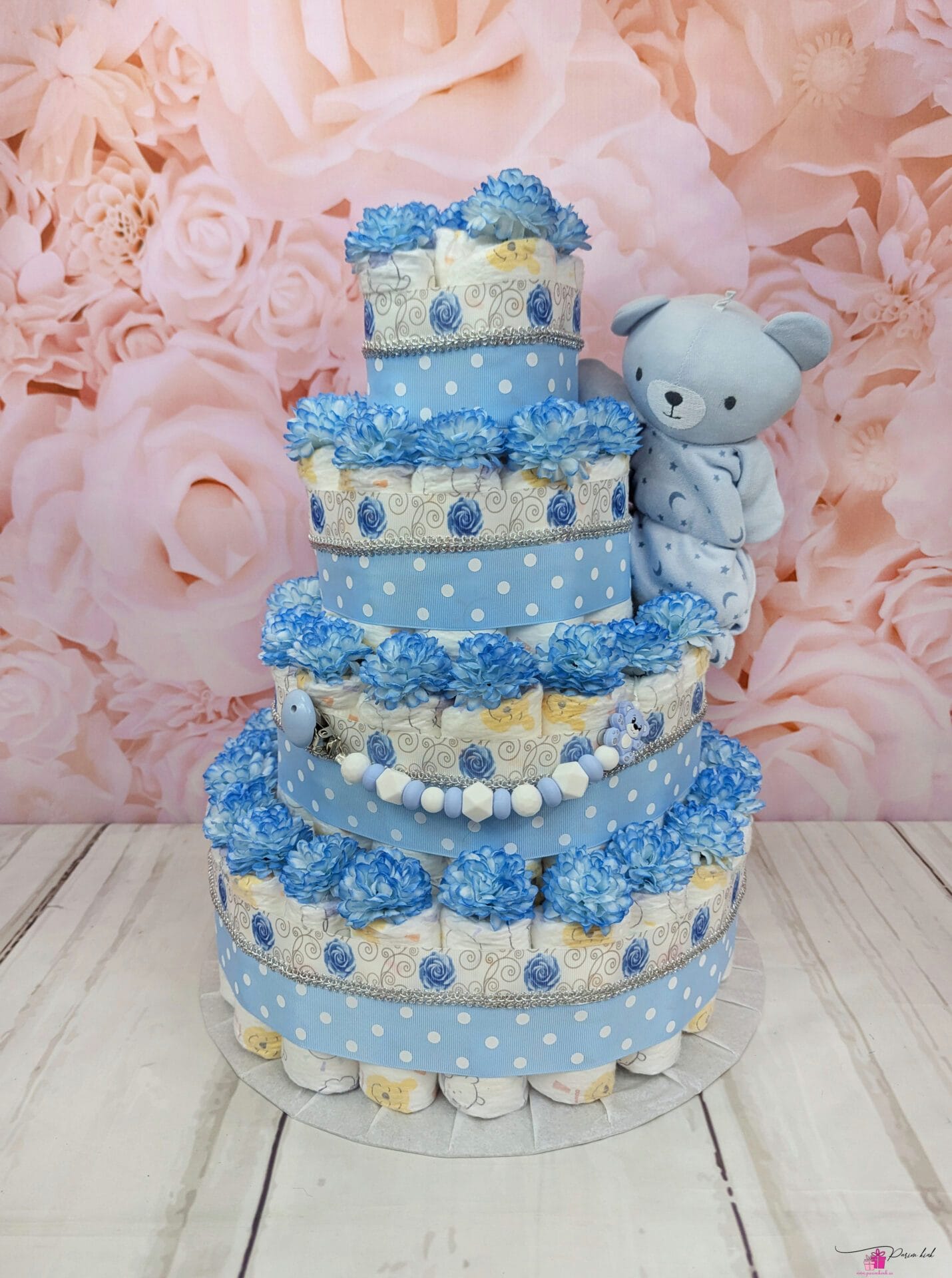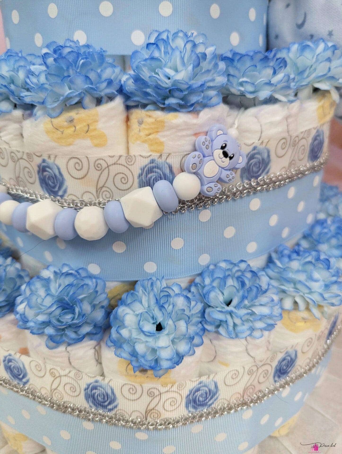 See mähkmetort on HIIGLANE! Ausalt, sõna otseses mõttes! Tegu on neljakordse mähkmetordiga, mis sisaldab 103 mähet meie tavapärase 55 mähkme asemel, lisaks lutiketti ja nunnut karu kaisutekki! Meie kolmekordsed tordid on juba suured, see neljakordne mähkmetort on paks nagu Paks Margareeta ja kõrge nagu Vabadussõja võidusammas!