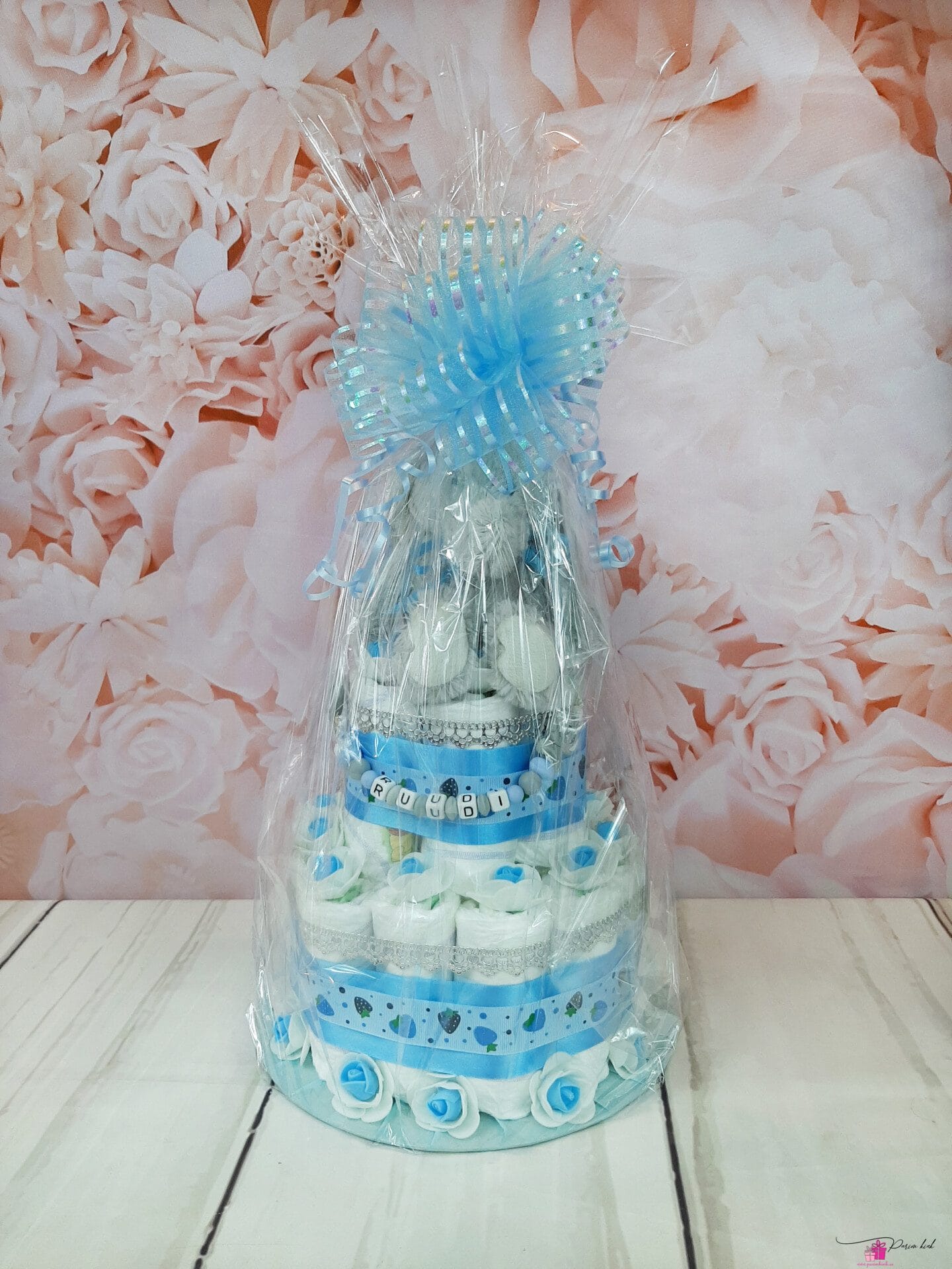 Mähkmetort on valmistatud 25-st mähkmest, pakitud tsellofaani ning kaunistatud suure rosetiga.