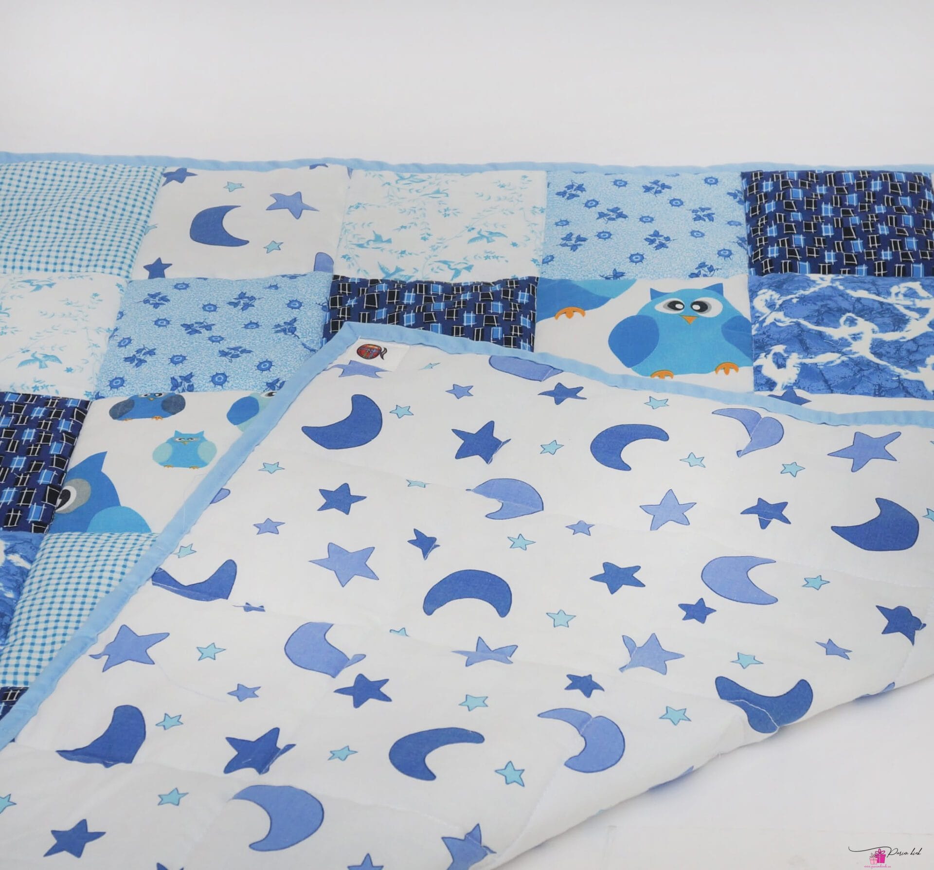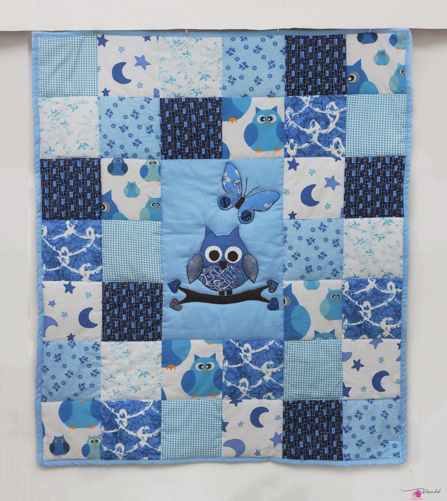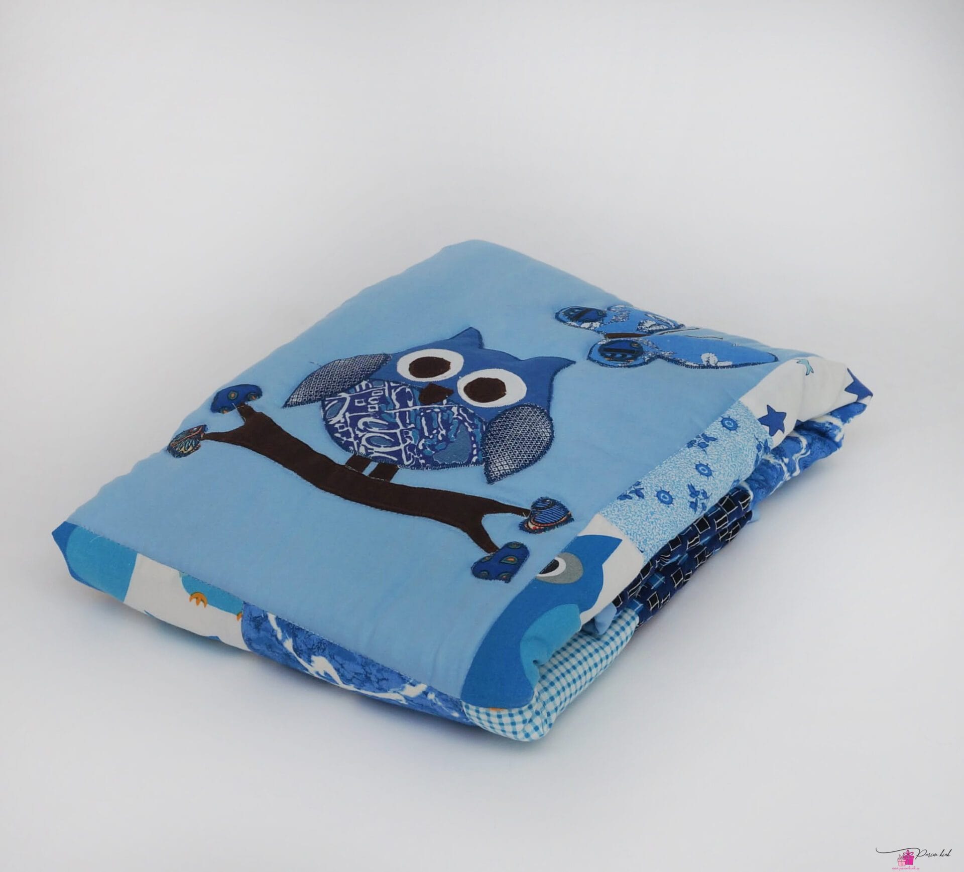Armas sinine öökulli ja liblikaga beebitekk, mis sobib suurepäraselt beebi esimeseks tekiks. Tekk on imearmas ja praktiline katsikukingitus. Õmmeldud puuvillastest kangastest ning sees on mahuline vatiin.