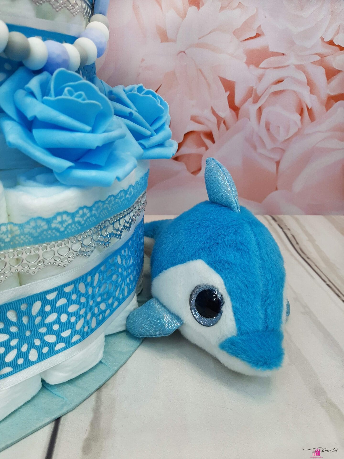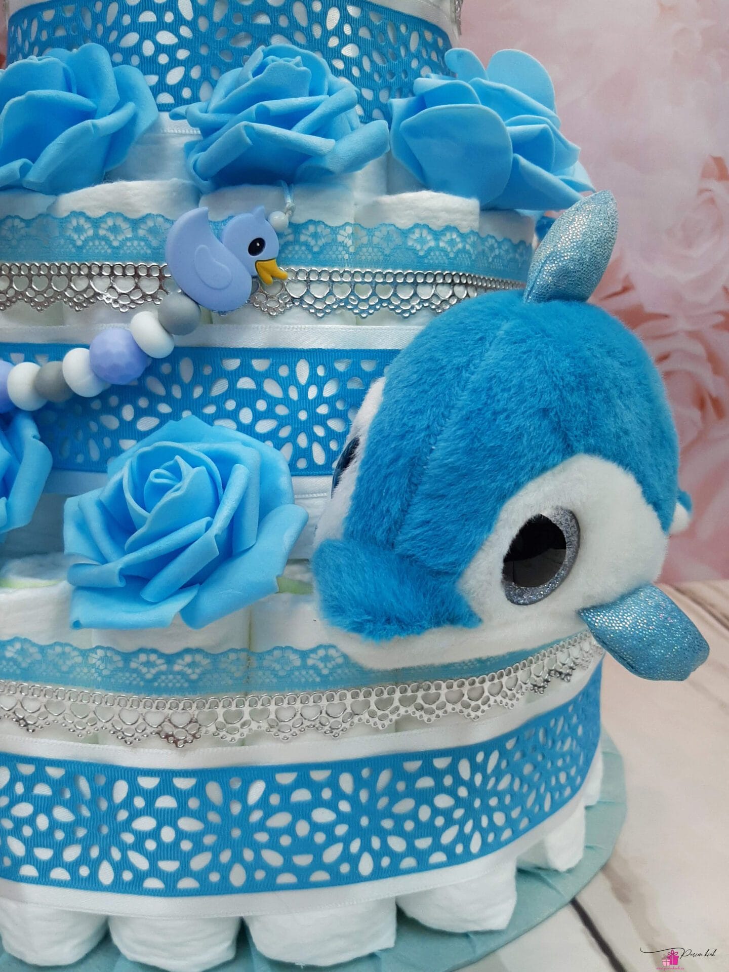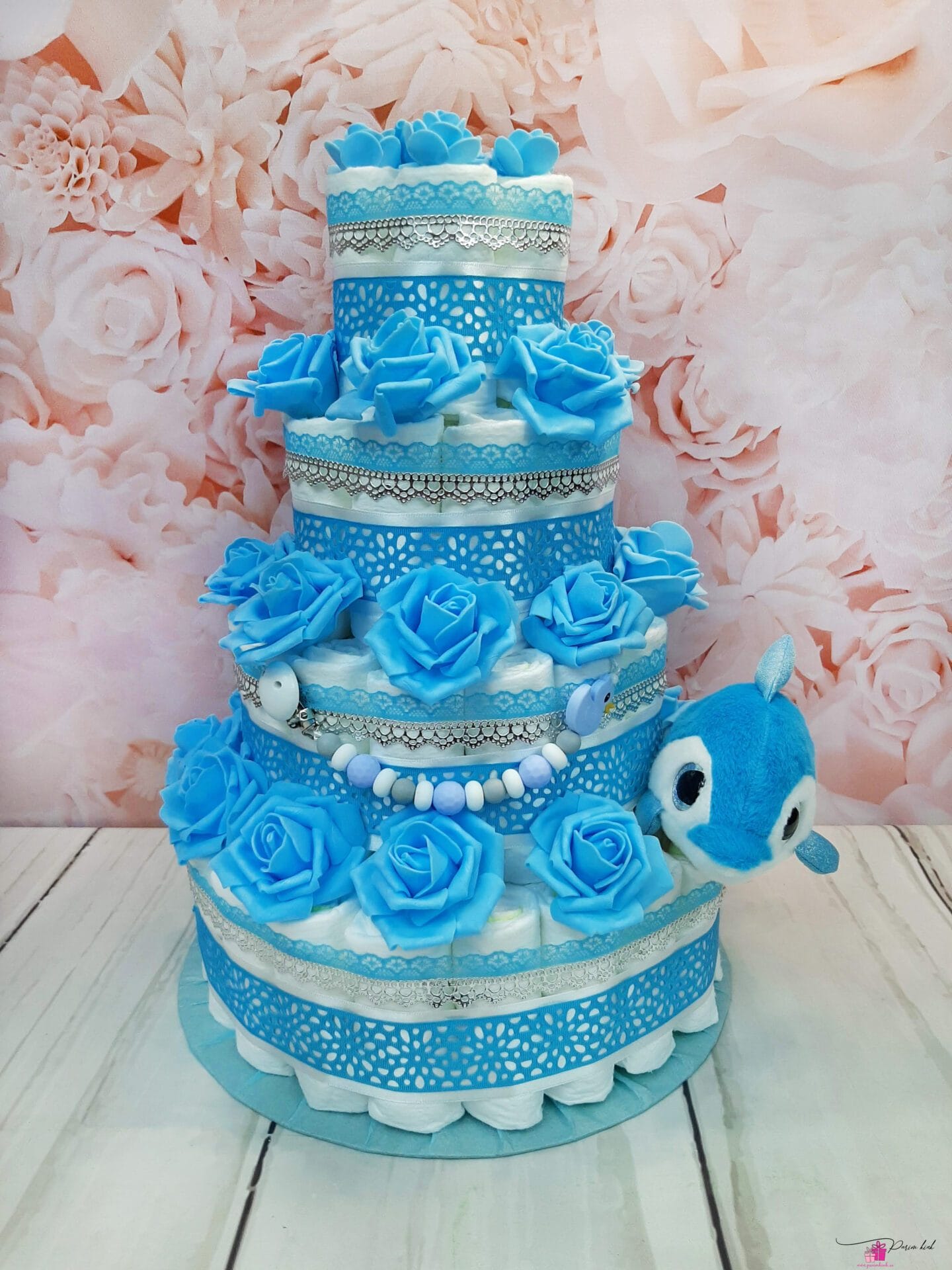 See mähkmetort on HIIGLANE! Ausalt, sõna otseses mõttes! Tegu on neljakordse mähkmetordiga, mis sisaldab 103 mähet meie tavapärase 55 mähkme asemel, lisaks lutiketti ja nunnut delfiini! Meie kolmekordsed tordid on juba suured, see neljakordne mähkmetort on paks nagu Paks Margareeta ja kõrge nagu Vabadussõja võidusammas!
