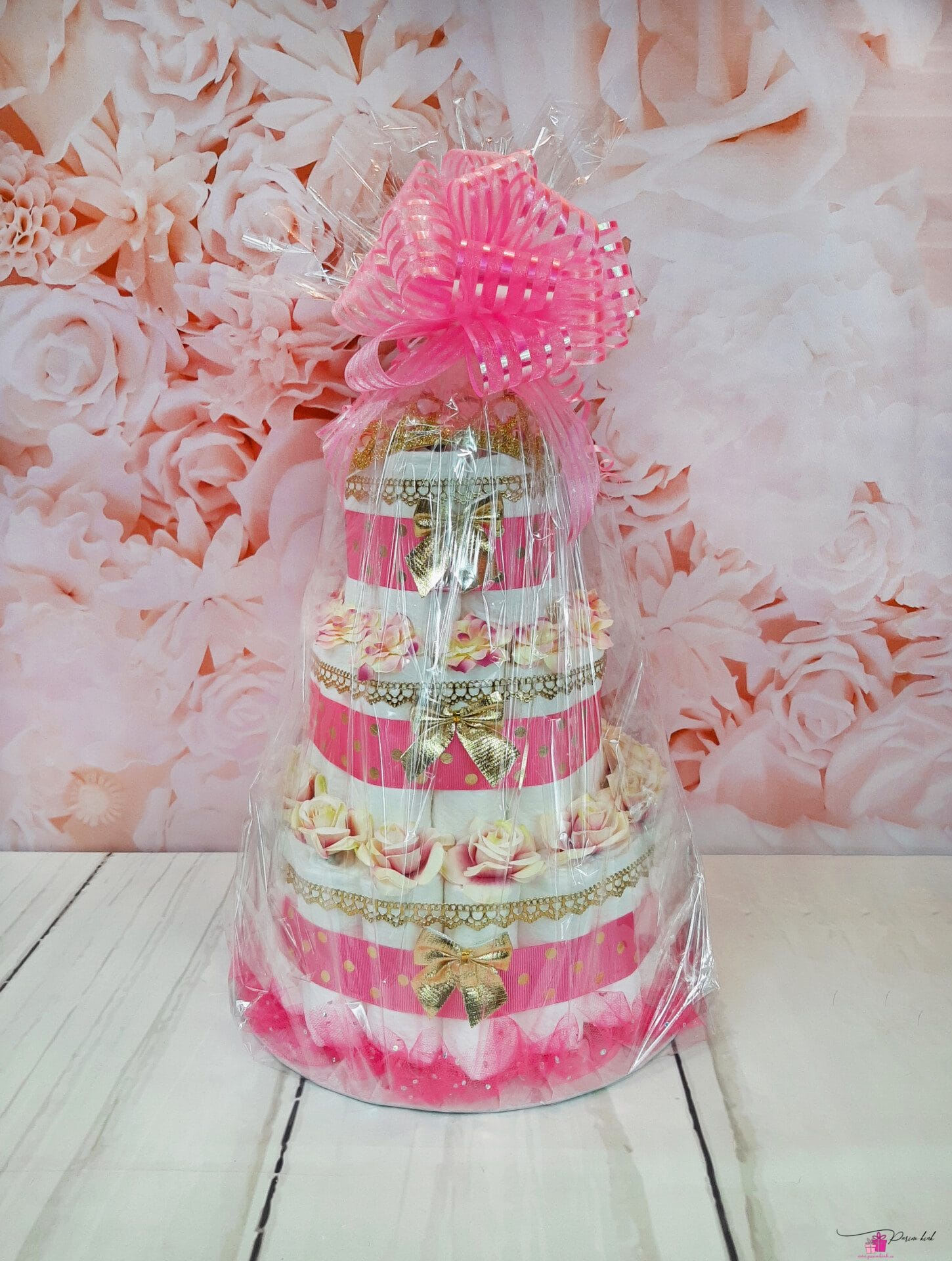 Mähkmetort on valmistatud 55-st mähkmest, pakitud tsellofaani ning kaunistatud suure rosetiga.