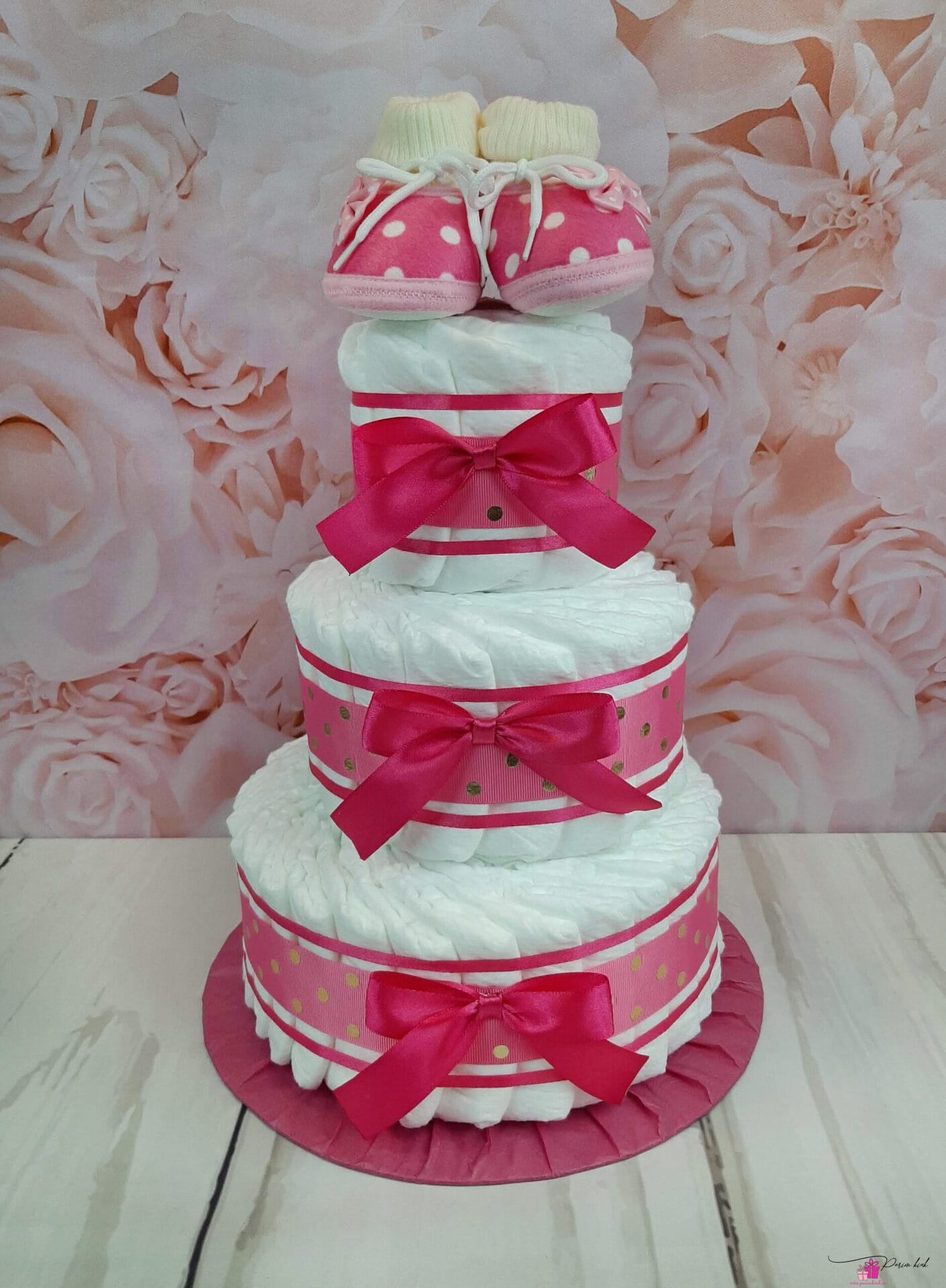 Tumeroosa kuldsete täppidega mähkmetort, mille otsas on armsad papud beebile kandmiseks.