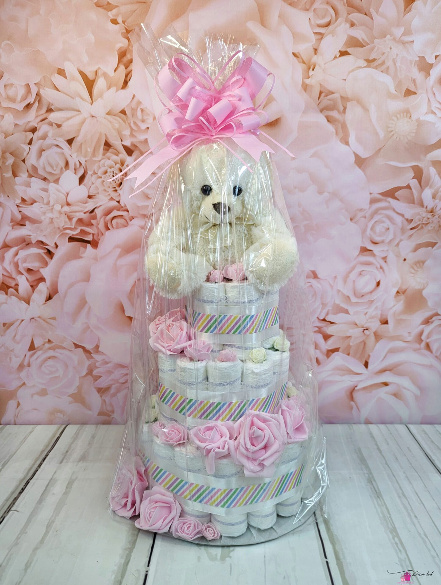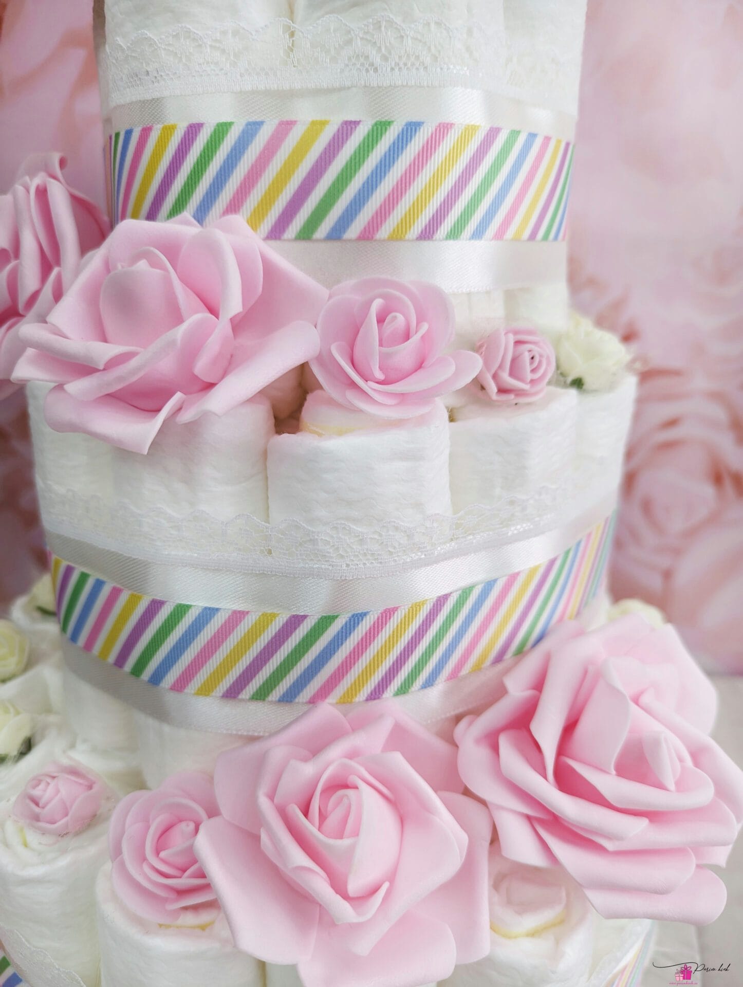 Mähkmetort on valmistatud 55-st mähkmest, pakitud tsellofaani ning kaunistatud suure rosetiga.